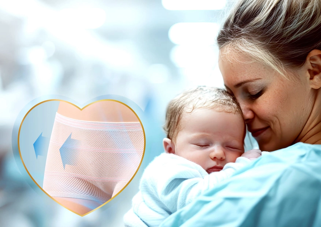 La coupe plus haute offre un léger maintien du ventre et une couverture délicate de la cicatrice, tout en maintenant de manière fiable les protections post-partum.