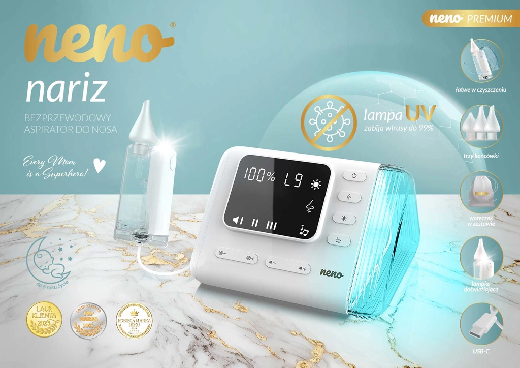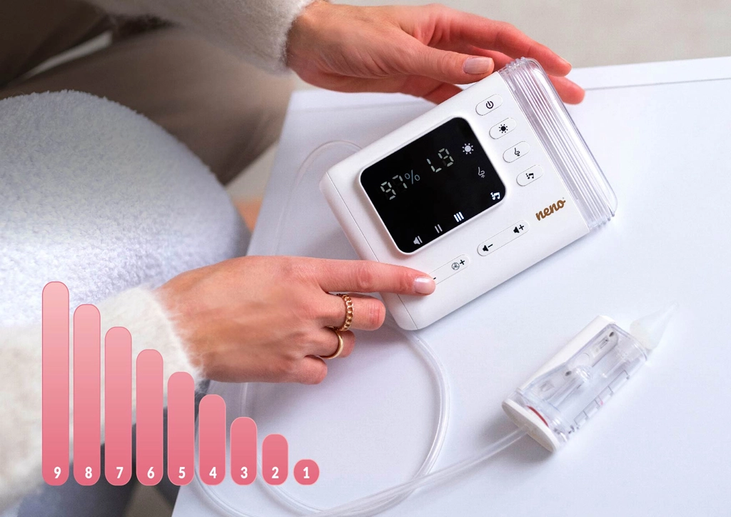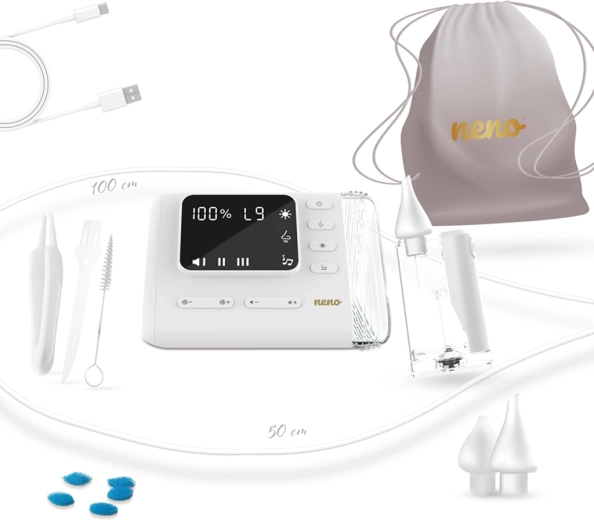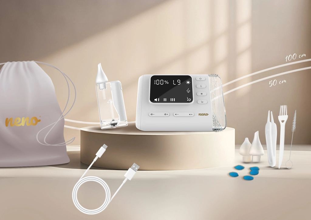 L’aspirateur nasal électrique Neno Nariz libère en douceur le nez bouché des nourrissons comme des enfants plus grands. Il offre jusqu’à 9 niveaux d’aspiration, la fonction Active Airflow pour un nettoyage efficace et délicat, une stérilisation UV intégrée des accessoires et un fonctionnement silencieux. Grâce à l’utilisation sans fil, au rétroéclairage LED et aux mélodies et bruit blanc apaisants, l’aspiration est confortable à la maison comme en déplacement.