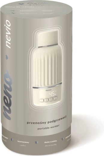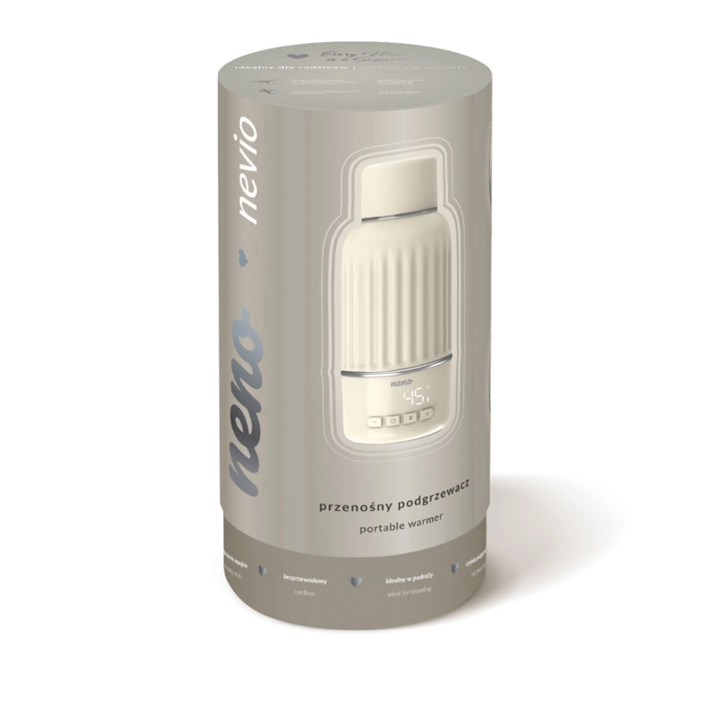 Nous présentons Neno Nevio – un chauffe-biberon portable compact qui assure un chauffage rapide et une régulation précise de la température de 35 à 55 °C avec une exactitude de 1 °C. Grâce à sa capacité de 500 ml, à son bec ergonomique et à son double joint, il est idéal à la maison comme en déplacement. Son couvercle pratique, qui sert également de verre, et sa charge rapide font de Nevio un allié fiable pour le lait et d’autres boissons.