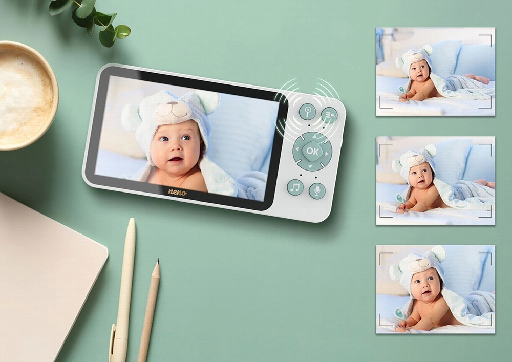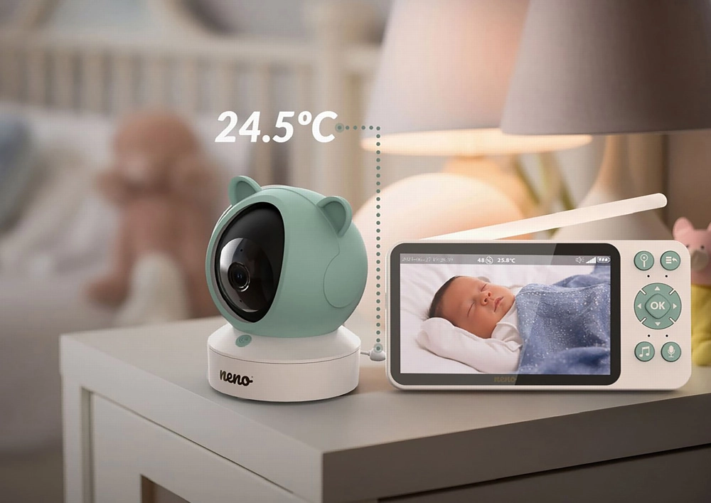 Le babyphone vidéo NENO Ivo vous apporte assurance et sérénité – que vous soyez au salon, au jardin ou hors de la maison. La caméra motorisée en Full HD (1080p) couvre un large angle de 355°/55°, tandis que le grand écran 5" offre une image claire immédiate sans délai. La vision nocturne automatique assure une image nette dans l’obscurité jusqu’à 5 mètres.