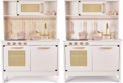 Cette cuisine en bois inspirée des styles rétro et boho séduit par son élégante combinaison de blanc, crème et détails dorés. La plupart des éléments sont en bois/MDF, avec une surface lisse poncée et peinte avec des peintures non toxiques pour un jeu en toute sécurité. Des boutons rotatifs, des portes ouvrantes et des crochets pour ustensiles invitent à l’exploration et apprennent aux enfants l’ordre et l’organisation.