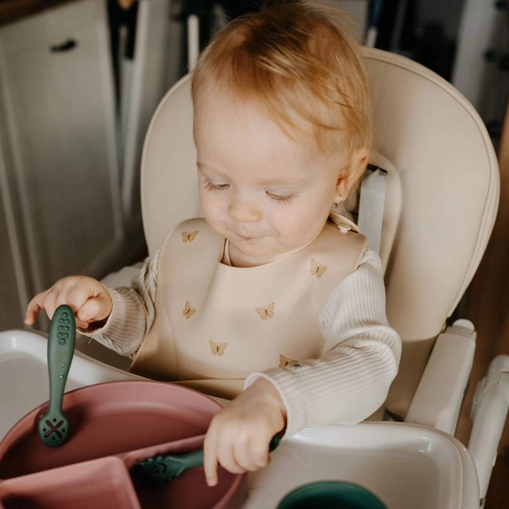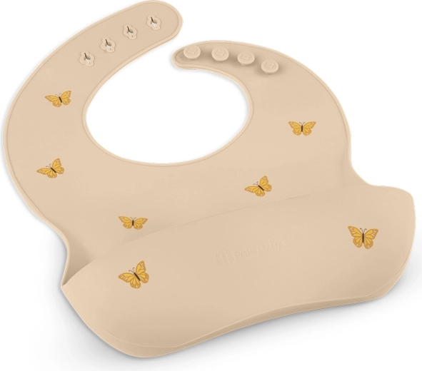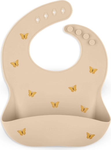 Le bavoir en silicone Petite&Mars Take&Match en teinte sable, orné de délicats motifs de papillons, est l’allié idéal pour les premières purées comme pour l’alimentation autonome. Sa forme ergonomique et son silicone souple s’adaptent agréablement au cou de l’enfant, tandis que la poche profonde capte efficacement les aliments qui tombent et garde les vêtements propres.