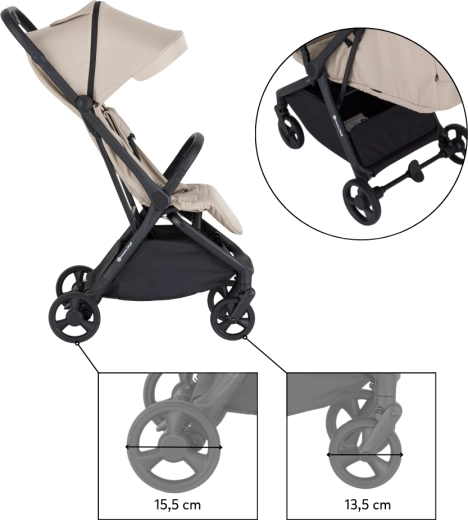 Elle offre à l’enfant un dossier entièrement réglable jusqu’à l’allongé avec ventilation, une canopée extensible avec visière et UPF 50+ et une fenêtre parentale avec fermeture magnétique silencieuse. Les roues en PU avec suspension et les roues avant pivotantes à 360° assurent une conduite fluide, tandis que le panier spacieux (3 kg) accueille l’essentiel pour vos sorties.