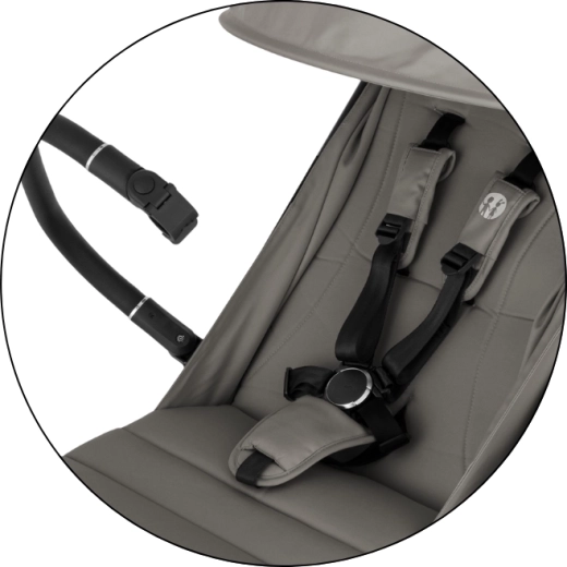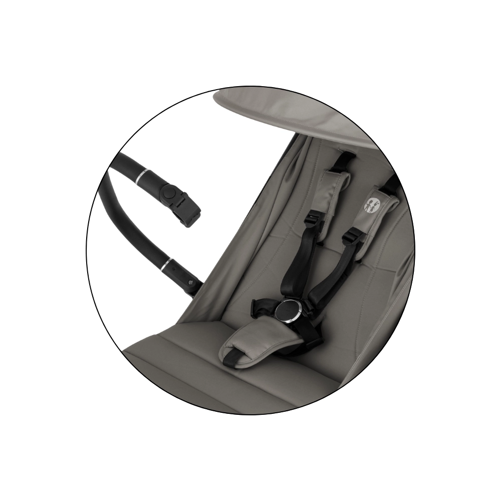 - Protection et sécurité – capote UPF50+, harnais 5 points avec boucle magnétique.