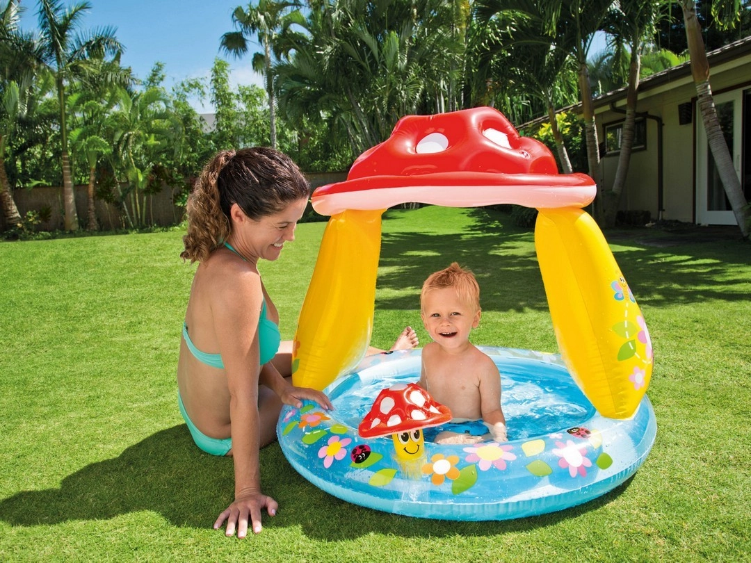 Adorable piscine pour enfants INTEX Amanite offrant une fraîcheur estivale sûre pour les tout-petits. Le pare-soleil intégré en forme d’amanite protège du soleil, le fond souple assure le confort et le PVC résistant supporte même les jeux les plus mouvementés. Inclus également une petite jouet gonflable et une rustine pour des réparations rapides.