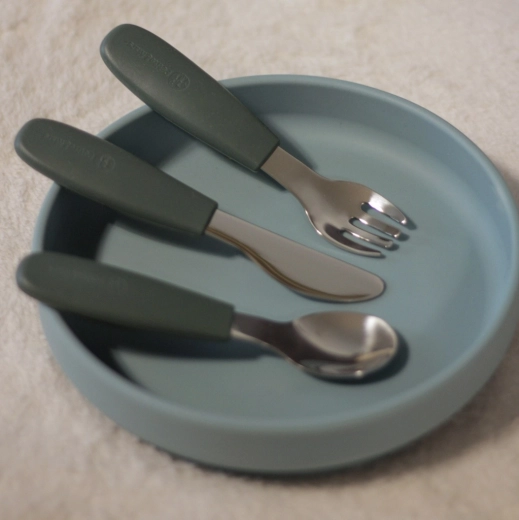 Le set stylé de couverts pour enfants Petite&Mars de la collection Take&Match est idéal pour les premiers repas en autonomie dès 12 mois. Il comprend une cuillère, une fourchette et un couteau sécurisé en acier inoxydable avec des manches ergonomiques antidérapants en silicone de qualité alimentaire. Des bords arrondis pour plus de sécurité, un design moderne dans la teinte Velvet Latte et un nettoyage facile au lave-vaisselle font de ce set un allié pratique au quotidien.