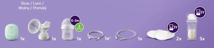 Unité moteur, tuyau en silicone, câble USB‑C, kit d’extraction avec insert, biberon Natural 125 ml, tétine à débit lent (1 pc), disque d’étanchéité (1 pc), capuchon à visser, sachets de conservation du lait (5 pcs), coussinets d’allaitement (4 pcs)