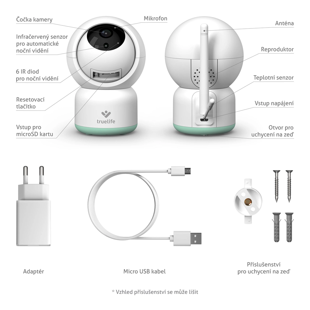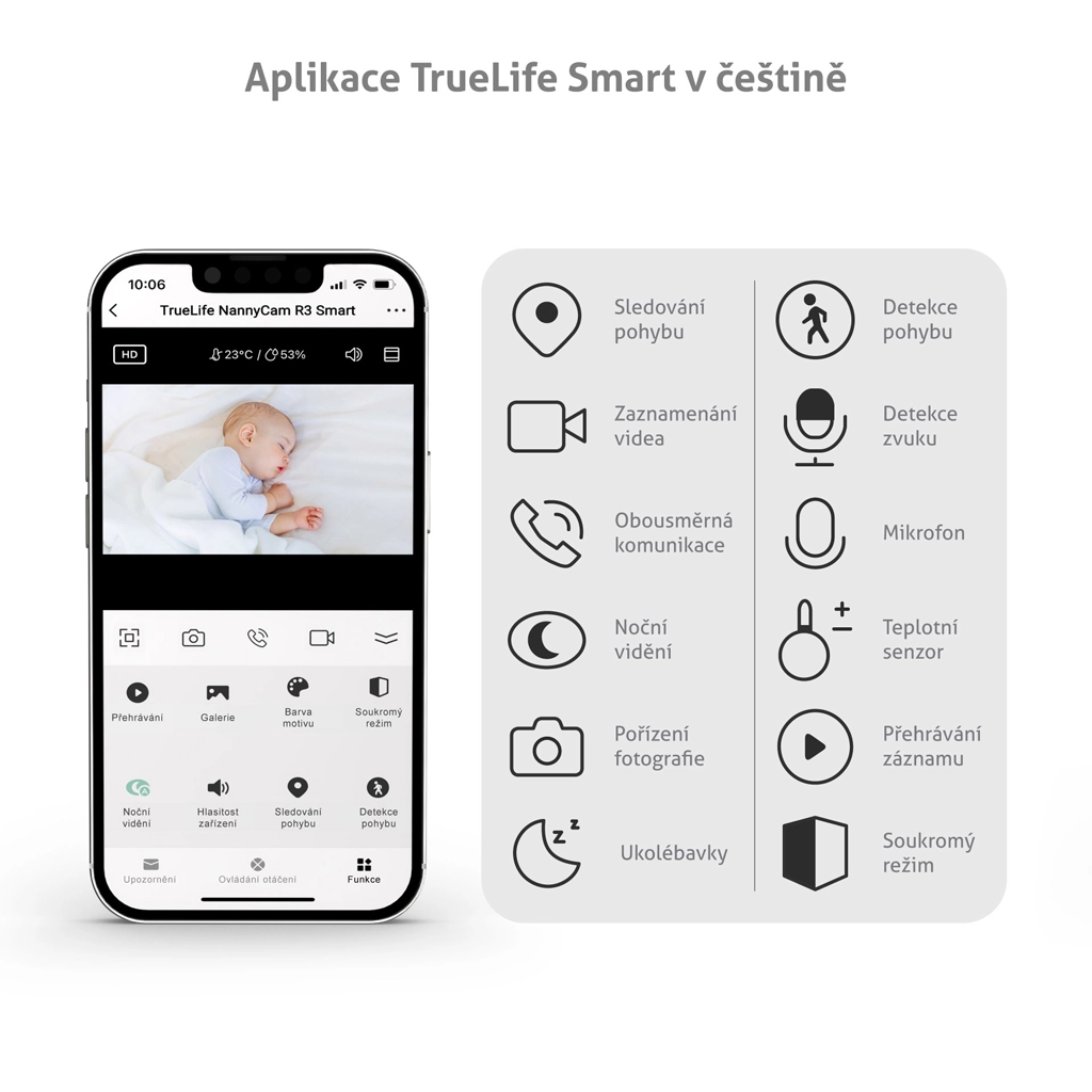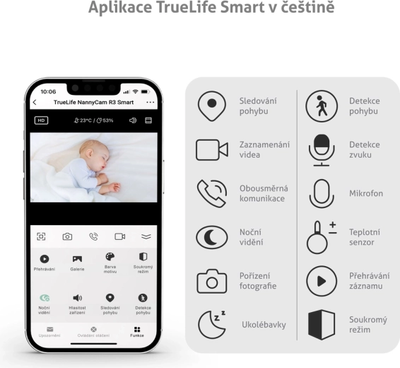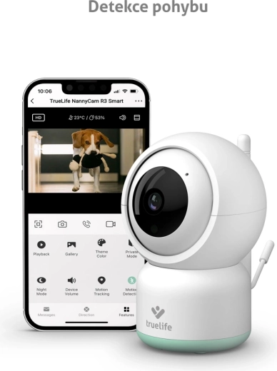 Le TrueLife NannyCam R3 Smart est un babyphone vidéo moderne pour le sommeil paisible de votre enfant et votre tranquillité d’esprit. La caméra motorisée avec un objectif grand angle de 100° et une résolution Full HD 1080p offre une image nette de jour comme de nuit grâce à la vision nocturne automatique. Via Internet, vous bénéficiez d’une portée illimitée et, dans l’application TrueLife Smart (entièrement en tchèque), vous voyez, entendez et réglez tout l’essentiel, y compris les alertes de mouvement, de son et de température.