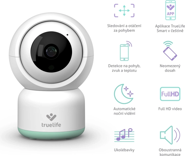Gardez votre bébé à l’œil où que vous soyez grâce au babyphone TrueLife NannyCam R3 Smart avec image Full HD 1080p, portée illimitée via Internet et fonctions intelligentes. Il offre une caméra motorisée avec suivi des mouvements, une vision nocturne, la détection du son, des mouvements et de la température, une communication bidirectionnelle ainsi que des berceuses. Commande facile dans l’application TrueLife Smart en tchèque, chiffrement sécurisé et possibilité d’enregistrement 24/7 sur microSD.