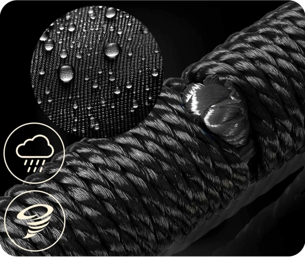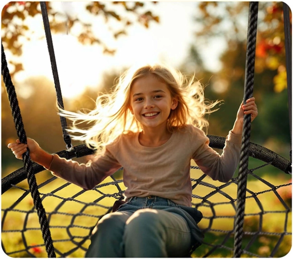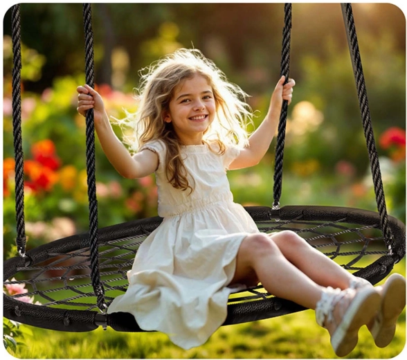 L’épaisseur et la qualité des cordes en PE assurent une résistance à l’abrasion, à l’humidité et au soleil. La balançoire se nettoie facilement et est prête pour un usage quotidien en extérieur.