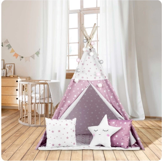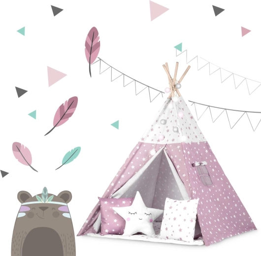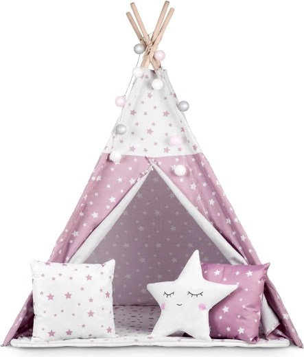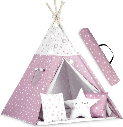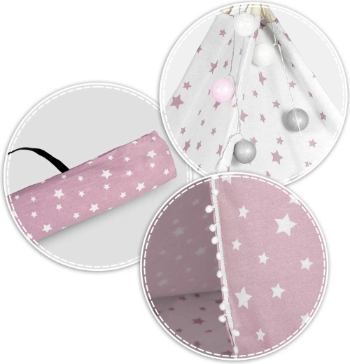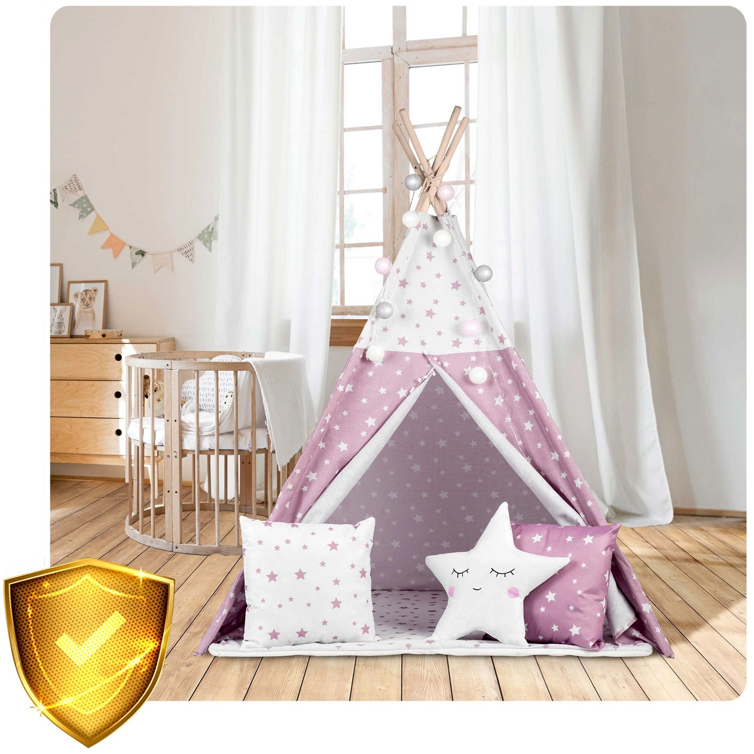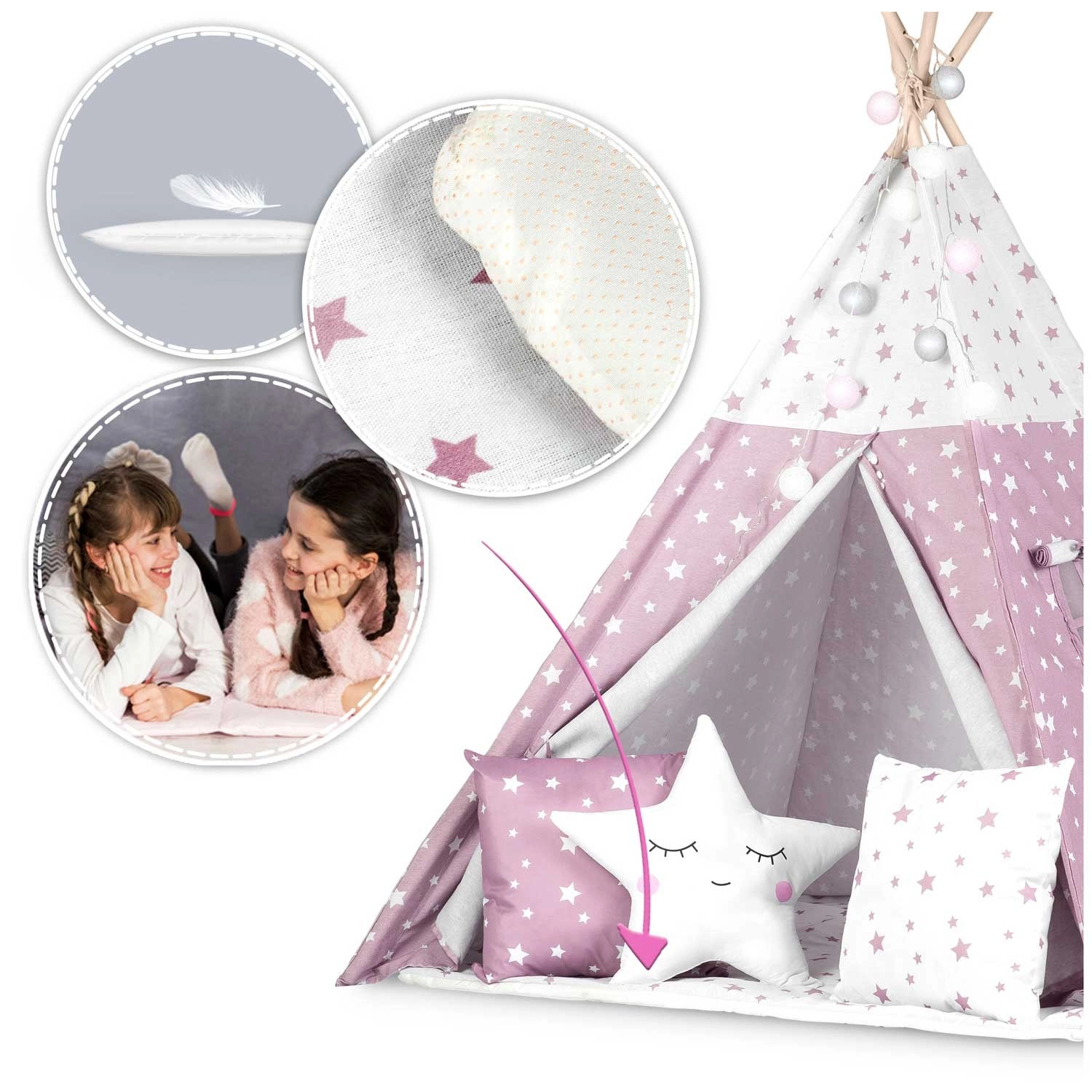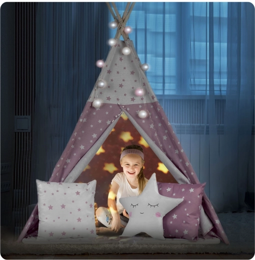 Le coffret inclut un tapis isolant moelleux avec picots antidérapants et trois coussins décoratifs qui assurent le confort pour lire ou se reposer. Grâce aux guirlandes LED à piles, créez en un instant une atmosphère magique. Le tipi se plie et se transporte facilement, et grâce à la housse fournie, vous pouvez le ranger ou l’emporter sur la terrasse ou à l’ombre du jardin.