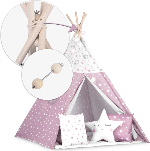 Quatre montants en bois de pin forment un cadre solide. Le stabilisateur fourni accroît la sécurité et maintient le tipi dans une forme optimale pendant le jeu.