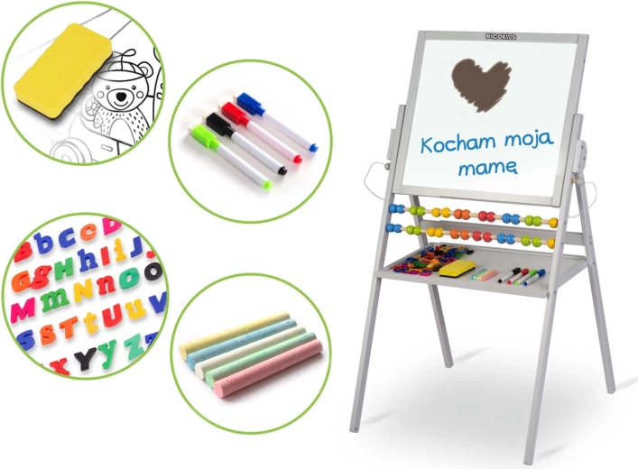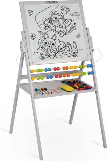 Le tableau double face RICOKIDS est un outil idéal pour un apprentissage créatif à la maison comme à la maternelle. Un côté est magnétique pour travailler avec des aimants et des feutres, l’autre est pour la craie afin de dessiner de manière classique. Il comprend également un boulier, qui soutient de façon ludique les premiers pas en mathématiques.
