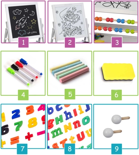 Grâce au riche ensemble d’accessoires, les enfants commencent à créer immédiatement : craies colorées, feutres effaçables, éponge, lettres et chiffres magnétiques, ainsi que les éléments de montage. Des matériaux sûrs et une structure stable en bois naturel apportent sérénité aux parents et joie aux enfants.