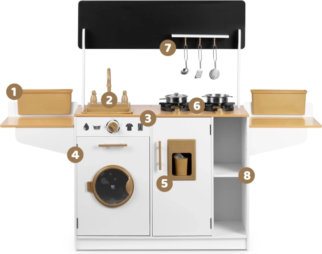 La cuisine en bois pour enfants RICOKIDS apporte des détails réalistes qui raviront les petits cuisiniers et cuisinières : boutons fonctionnels, évier avec robinets, portes ouvrantes et « appareils » comme une machine à laver ou un réfrigérateur avec distributeur de glaçons. Un ensemble de vaisselle métallique et des ustensiles de cuisine à suspendre sont également inclus.