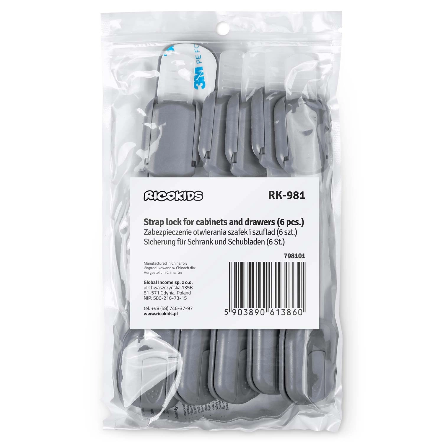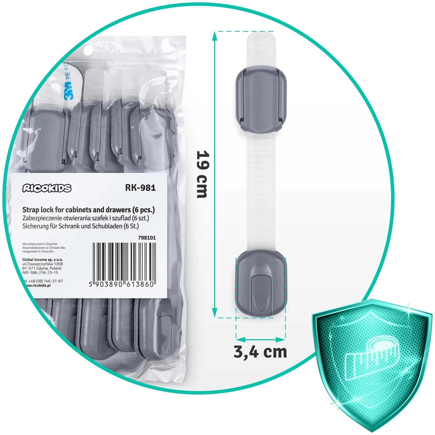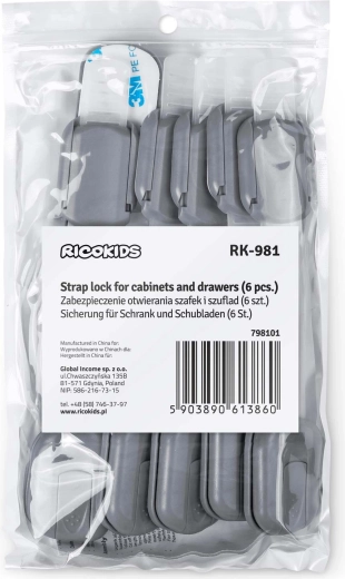 Une solution pratique et esthétique pour chaque foyer avec enfants. Les loquets de sécurité RICOKIDS disposent d’une sangle flexible et réglable pour s’adapter parfaitement à différentes surfaces et dimensions. L’installation est rapide et sans outils – dégraissez, retirez le film et appuyez.