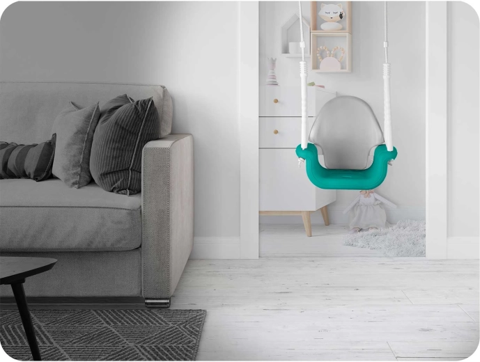 Trois modes faciles à changer : avec dossier et barre (6–36 mois), sans barre avant (3–5 ans) et balançoire classique sans dossier (5–10 ans). Une seule balançoire pour toute l’enfance.