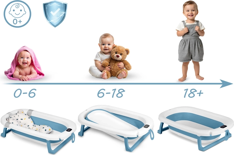 - 18+ mois : plus d’espace pour barboter en autonomie. La baignoire peut ensuite être réutilisée autrement – comme bac à balles, cuve de lavage ou pour le bain des animaux de compagnie.
