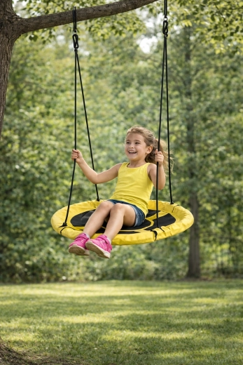 La balançoire nid jaune illumine instantanément toute cour ou jardin. Le large siège confortable, à surface résistante et bord rembourré, est solidement suspendu par quatre cordes, permettant aux enfants de profiter d’un balancement sécurisé assis ou allongés. Son diamètre de 100 cm offre assez d’espace pour un ou plusieurs enfants.