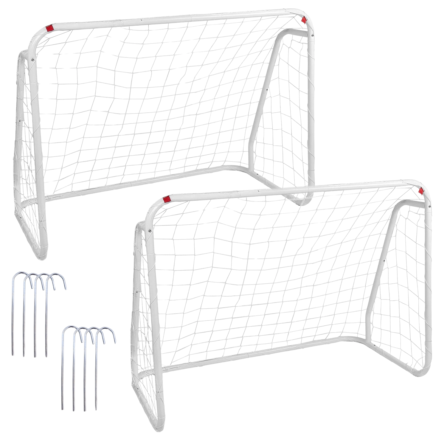 Le montage est intuitif et rapide – en quelques minutes, vous êtes prêt à jouer. Le paquet comprend quatre piquets d’ancrage qui fixent solidement les cages dans la pelouse. Grâce à leurs dimensions compactes, les cages se transportent et se rangent facilement.