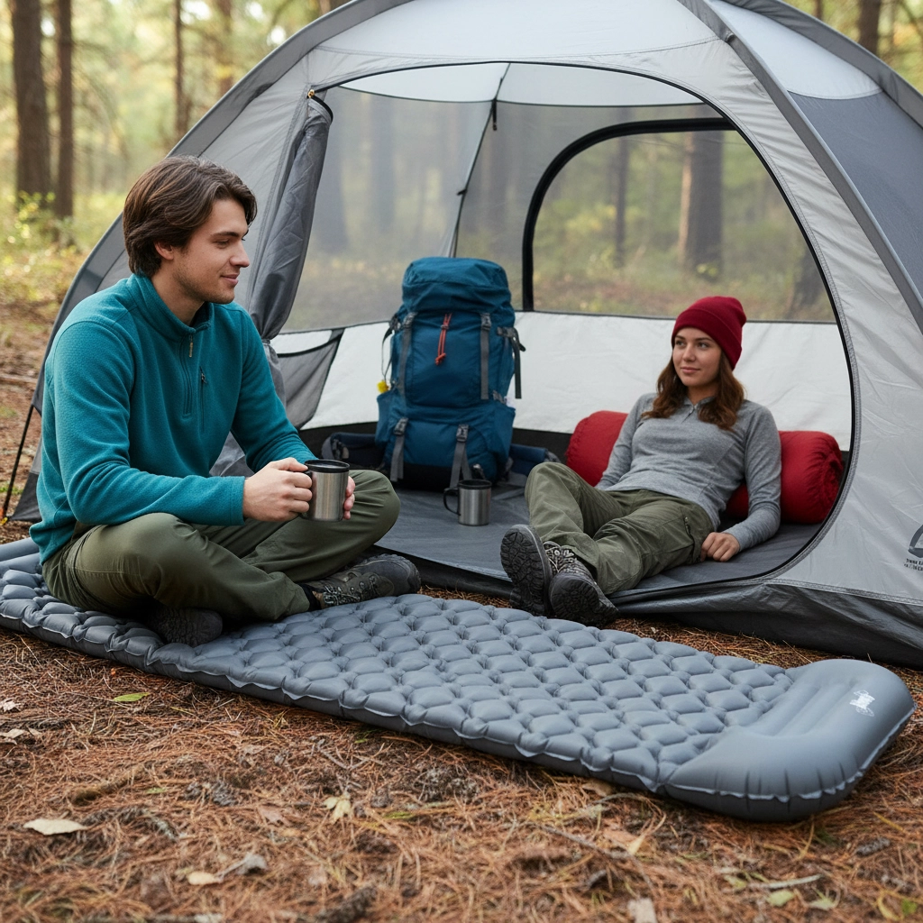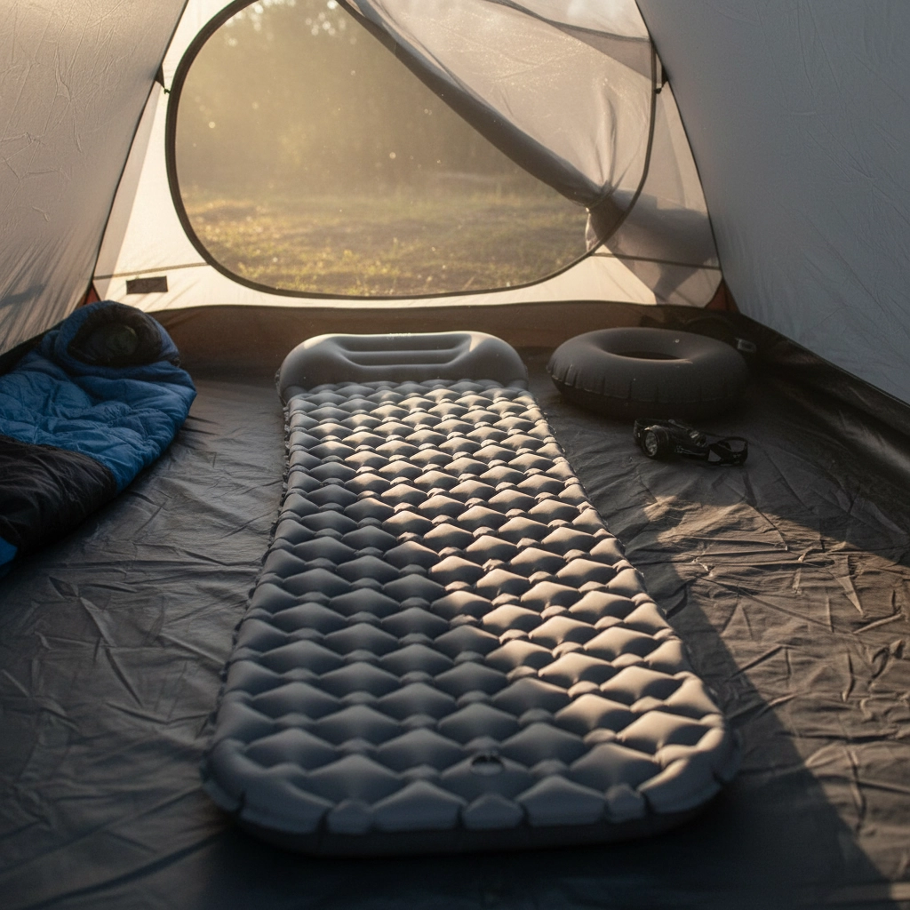 Matelas gonflable ultraléger avec oreiller intégré pour un sommeil confortable en voyage. Grâce au tissu 40D ripstop avec TPU, il est résistant à l’abrasion, offre une excellente isolation du sol et, une fois rangé, il est compact et léger (470 g) – idéal pour le camping, le trekking et les sorties à vélo.