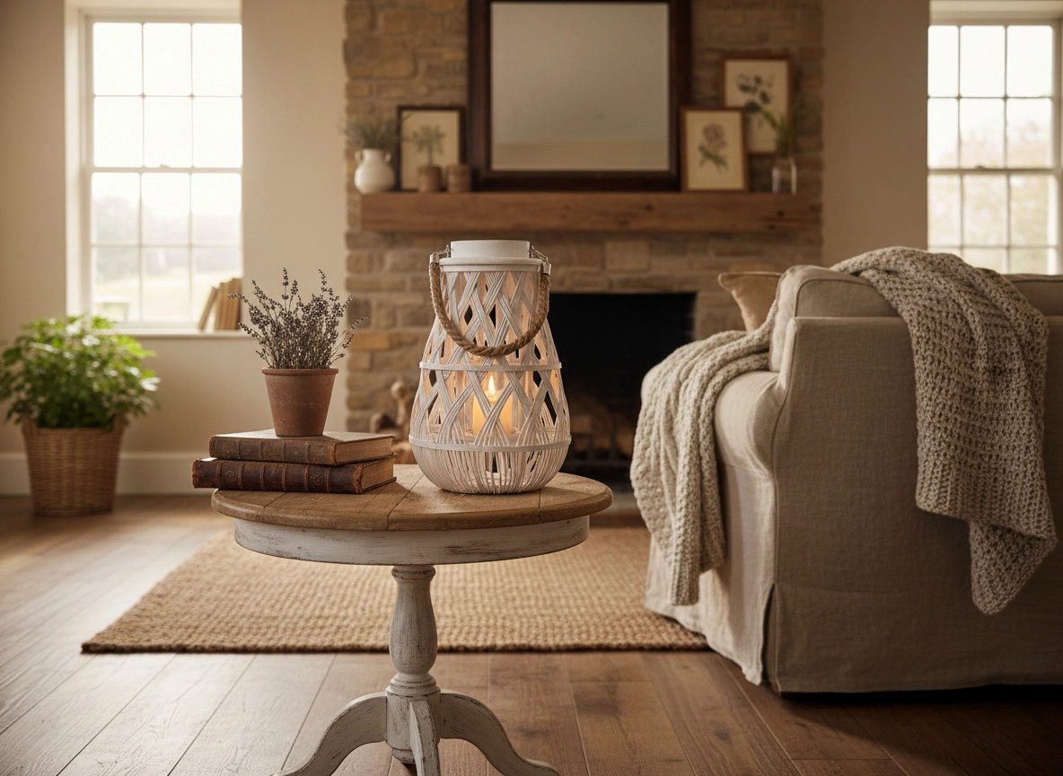 La lanterne se distingue sur une table basse, une commode ou dans un salon cosy. Elle apporte chaleur et accent visuel à l’espace.