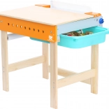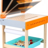 Découvrez une table pour enfants ingénieuse qui se transforme d’un geste d’une table à dessin en établi. Le panneau à dessin rabattable avec étagère pour les outils, le plateau de travail avec trous de fixation des pièces et le porte-rouleau de papier sur le côté font de cette table un lieu idéal pour créer et construire.