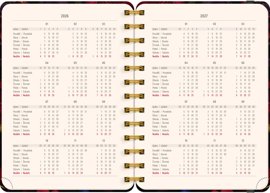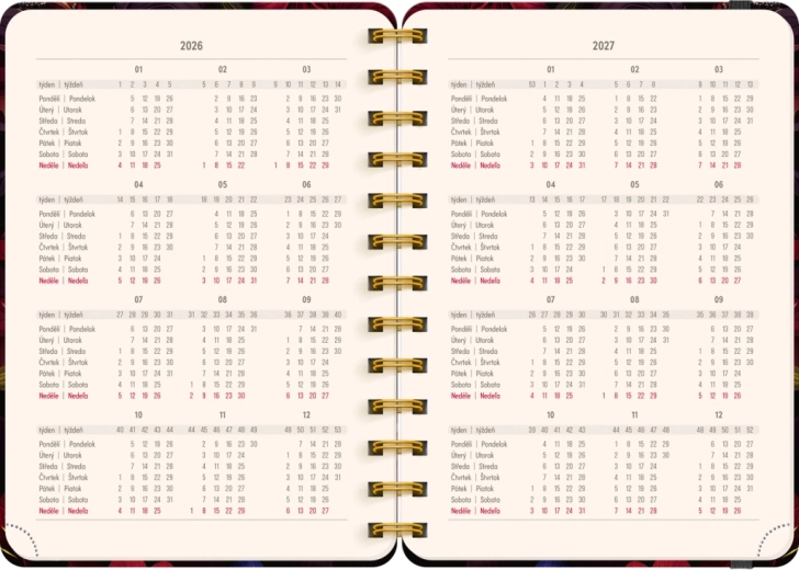 Élégante agenda de 18 mois au motif de fleurs rouges pour la période 07/2026–12/2027, proposant un calendrier hebdomadaire tchéco‑slovaque avec prénoms et jours de fête, des aperçus des années 2026 et 2027, ainsi que beaucoup d’espace pour les notes chaque semaine. Format compact 13 × 18 cm et reliure spirale pour écrire confortablement à la maison comme en déplacement.