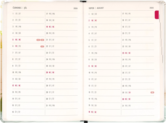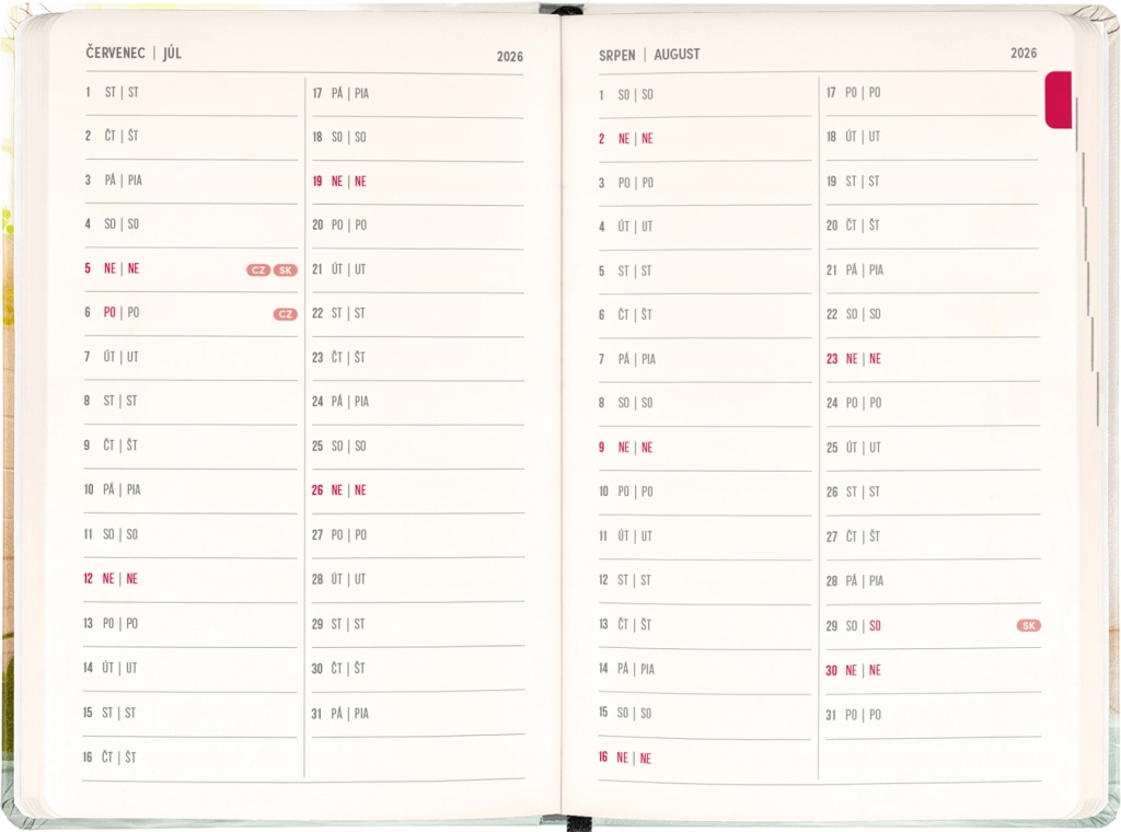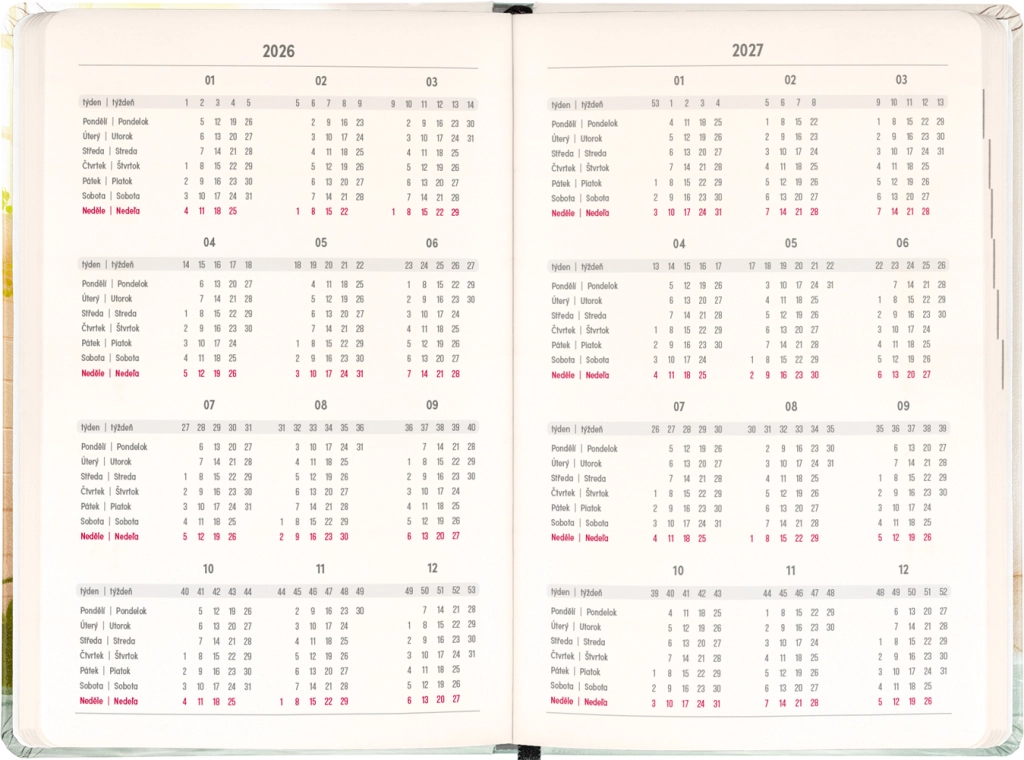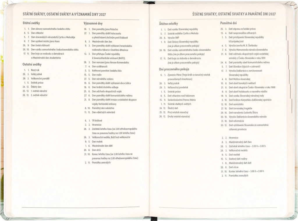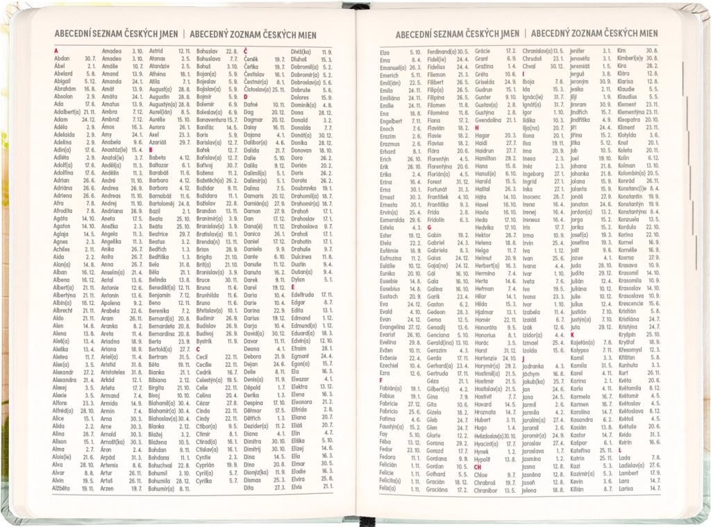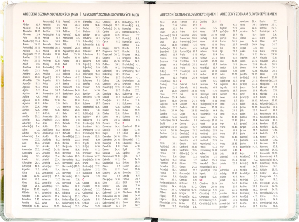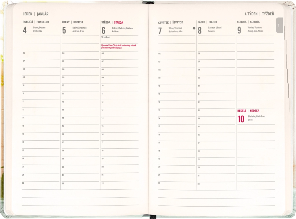Cet agenda ravira quiconque apprécie l’alliance de la fonctionnalité et d’un design ludique. Le calendrier tchéco‑slovaque avec prénoms et jours de fête facilite la planification et vous aide à ne pas oublier les dates importantes.