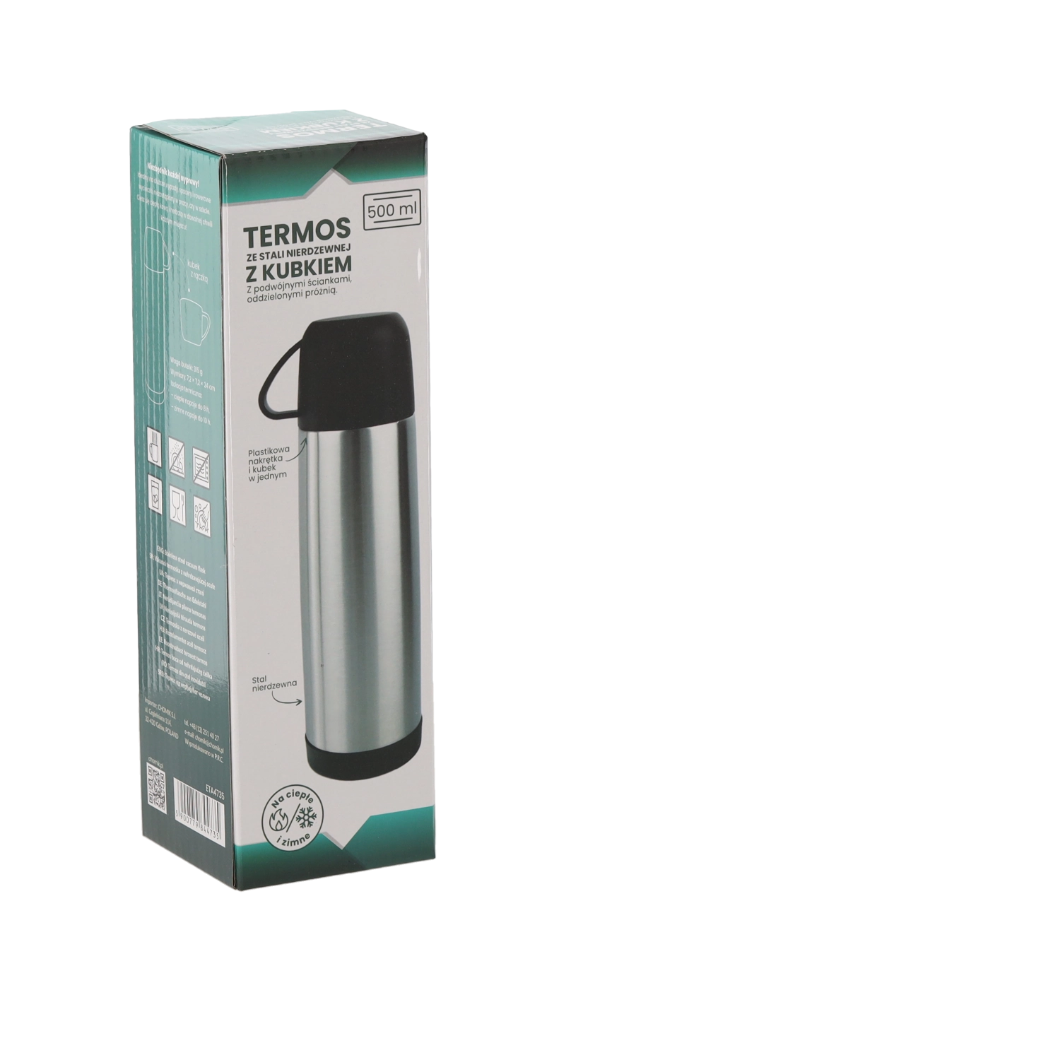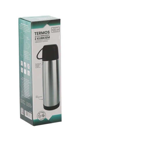 Pratique thermos avec tasse de 500 ml pour une utilisation quotidienne. Grâce à l’acier inoxydable à double paroi, les boissons restent chaudes longtemps – de 96 °C à 38–40 °C après 24 heures. Inclut une tasse en plastique résistante pour boire confortablement en déplacement.