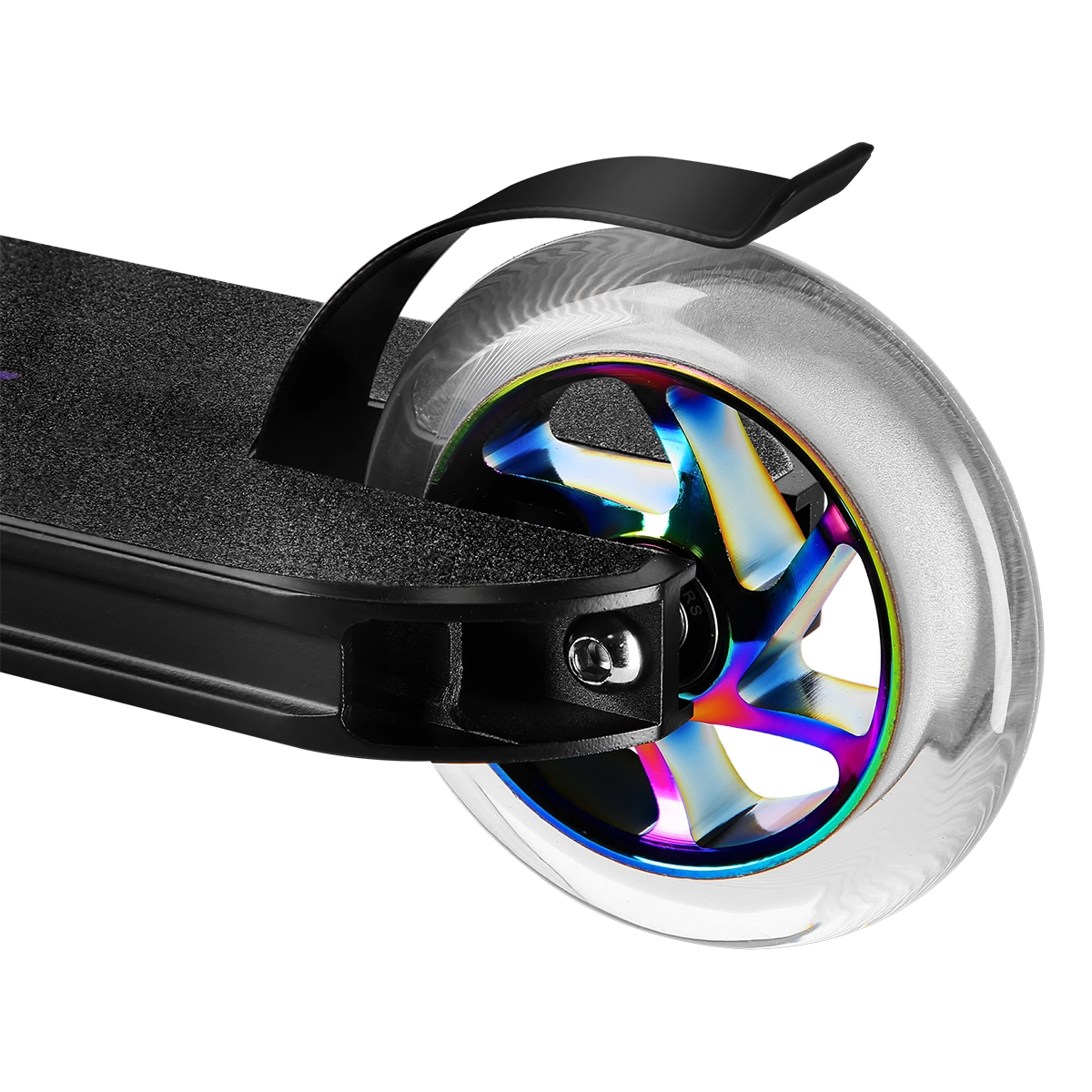 La glisse douce et vive est assurée par des roues 110 x 24 mm avec roulements ABEC 9, tandis que le frein arrière à pression type flex fender offre un arrêt immédiat et sûr. Le deck en aluminium à cinq chambres, le large guidon en T avec poignées en caoutchouc et le jeu de direction IHC press-fit apportent stabilité, précision de pilotage et rotation fluide du guidon à 360°.