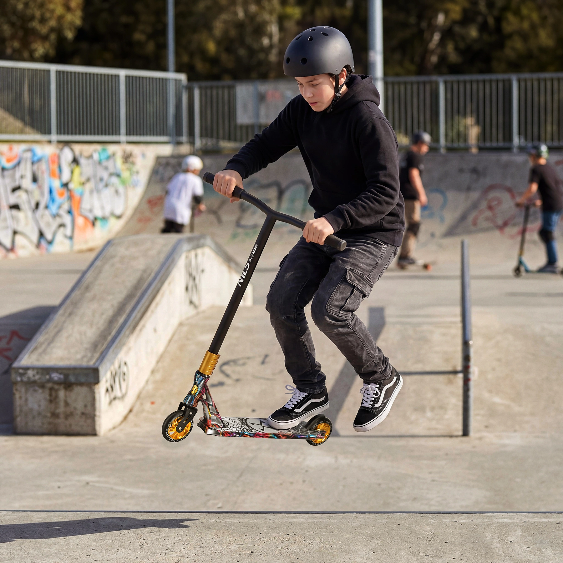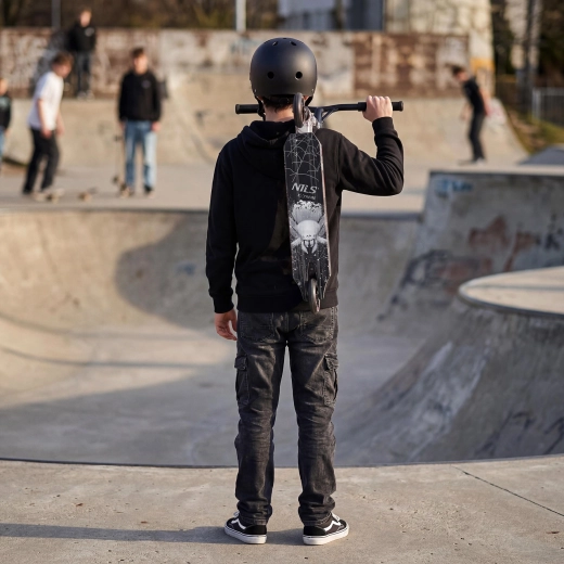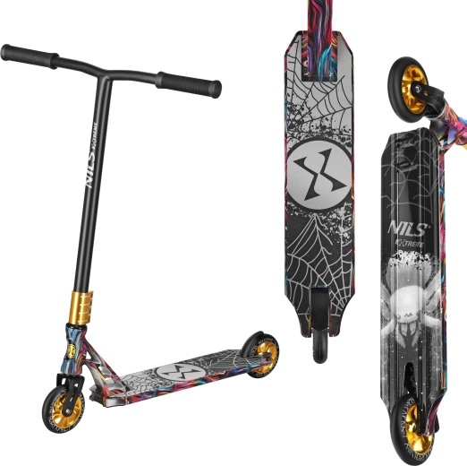 La trottinette NILS Extreme Spider HS221 est conçue pour les figures, les sauts et des réceptions fluides. Le cadre rigide sans mécanisme pliant augmente la rigidité, la stabilité et la précision de conduite. Le guidon T-bar noir avec poignées TPE confortables garde la trajectoire même lors de tricks exigeants, tandis que le deck compact avec grip adhérent assure une parfaite tenue sous les pieds.