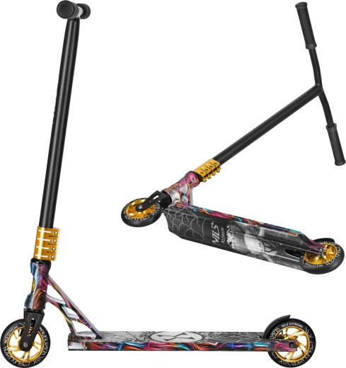 Les roulements rapides ABEC-9 et les roues PU 110 × 24 mm avec moyeux en aluminium garantissent un roulement fluide, rapide et durable. Son design inspiré du street art combine un motif de toile d’araignée et des détails dorés contrastés (collier, moyeux) pour un look marqué et sportif.