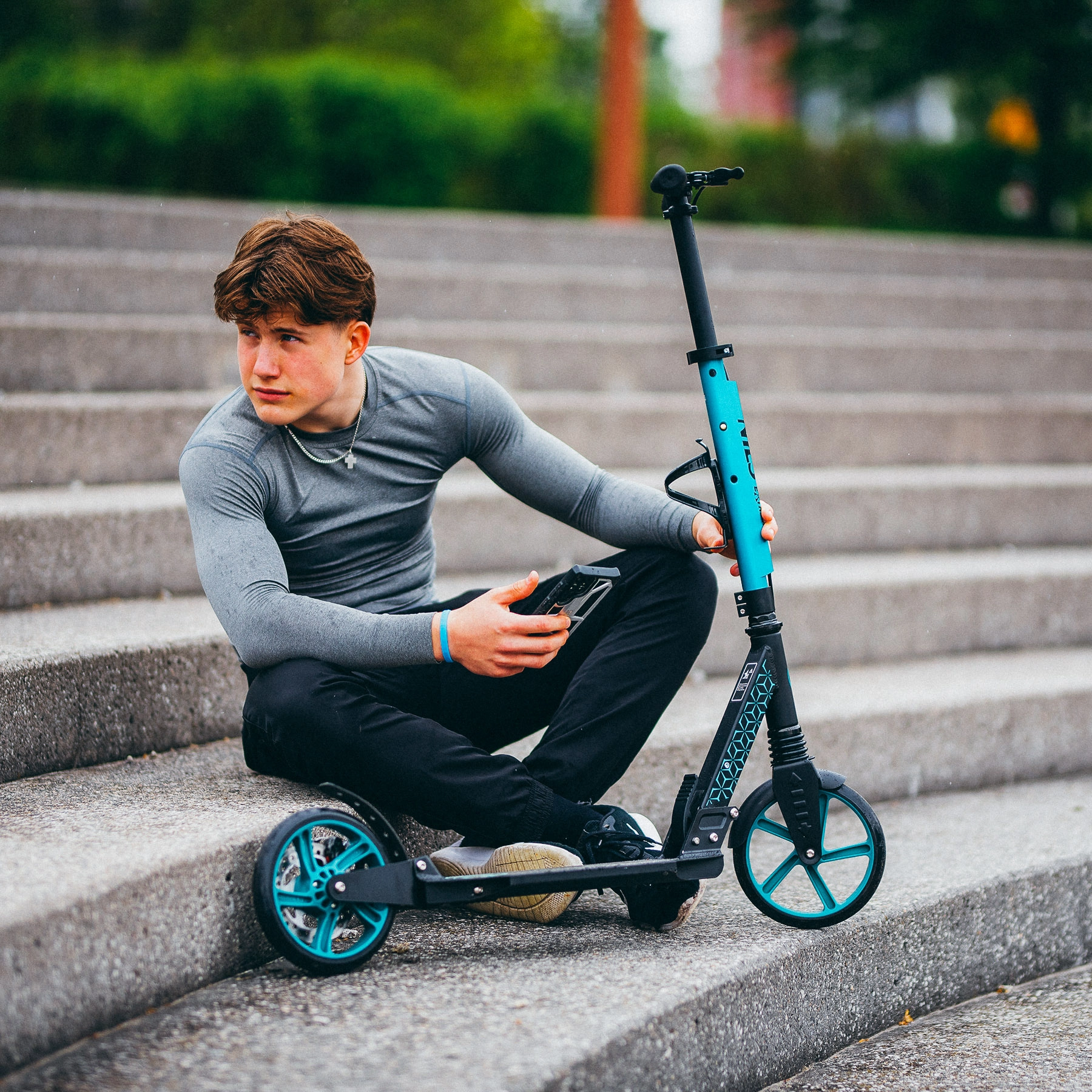 La trottinette NILS Extreme HM124T en coloris turquoise allie design moderne, qualité de fabrication et sécurité. Grâce à son cadre en aluminium léger, elle se transporte facilement tout en restant solide et fiable. Les grandes roues en polyuréthane de 200 mm de diamètre et les roulements précis ABEC 7 assurent une conduite fluide et silencieuse sur l’asphalte comme sur les trottoirs stabilisés.