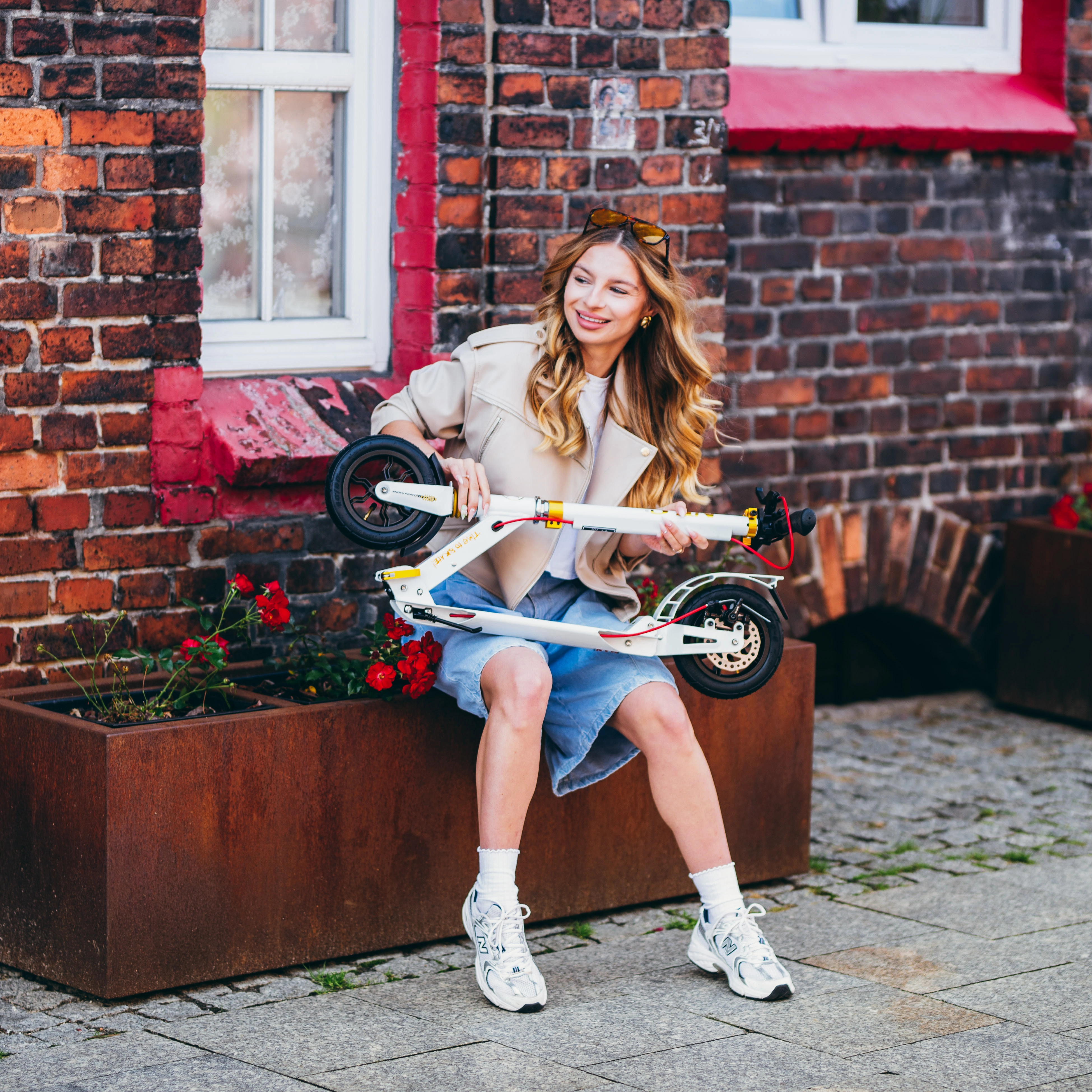 L’amortisseur avant et arrière, combiné aux roues pneumatiques de 200 mm, absorbe les irrégularités et améliore le confort ainsi que la stabilité lors des trajets urbains.