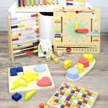 L’apprentissage se fait de manière ludique – les enfants prennent en main les pièces avec exercices, cherchent les bonnes solutions et les replacent dans la grille. Grâce au code couleur clair et au cadre en bois pratique, tout reste bien organisé.