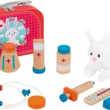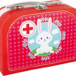 seringue, thermomètre, pince, stéthoscope, pommade, comprimés, lapin en peluche, mallette portable