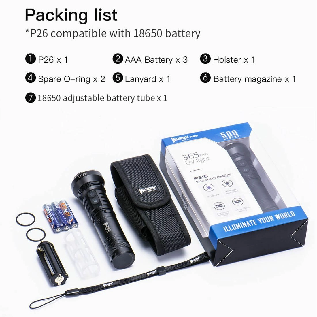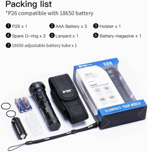 Grâce à la combinaison de 1× Cree XPG3 pour la lumière blanche et 1× LED UV, la P26 délivre jusqu’à 500 lumens, trois modes pratiques et un basculement rapide. L’alimentation flexible par 3× AAA ou 1× 18650 Li‑ion compatible prolonge l’autonomie et assure une meilleure disponibilité d’énergie sur le terrain. L’indicateur d’état de batterie intégré facilite la planification du remplacement ou de la recharge.