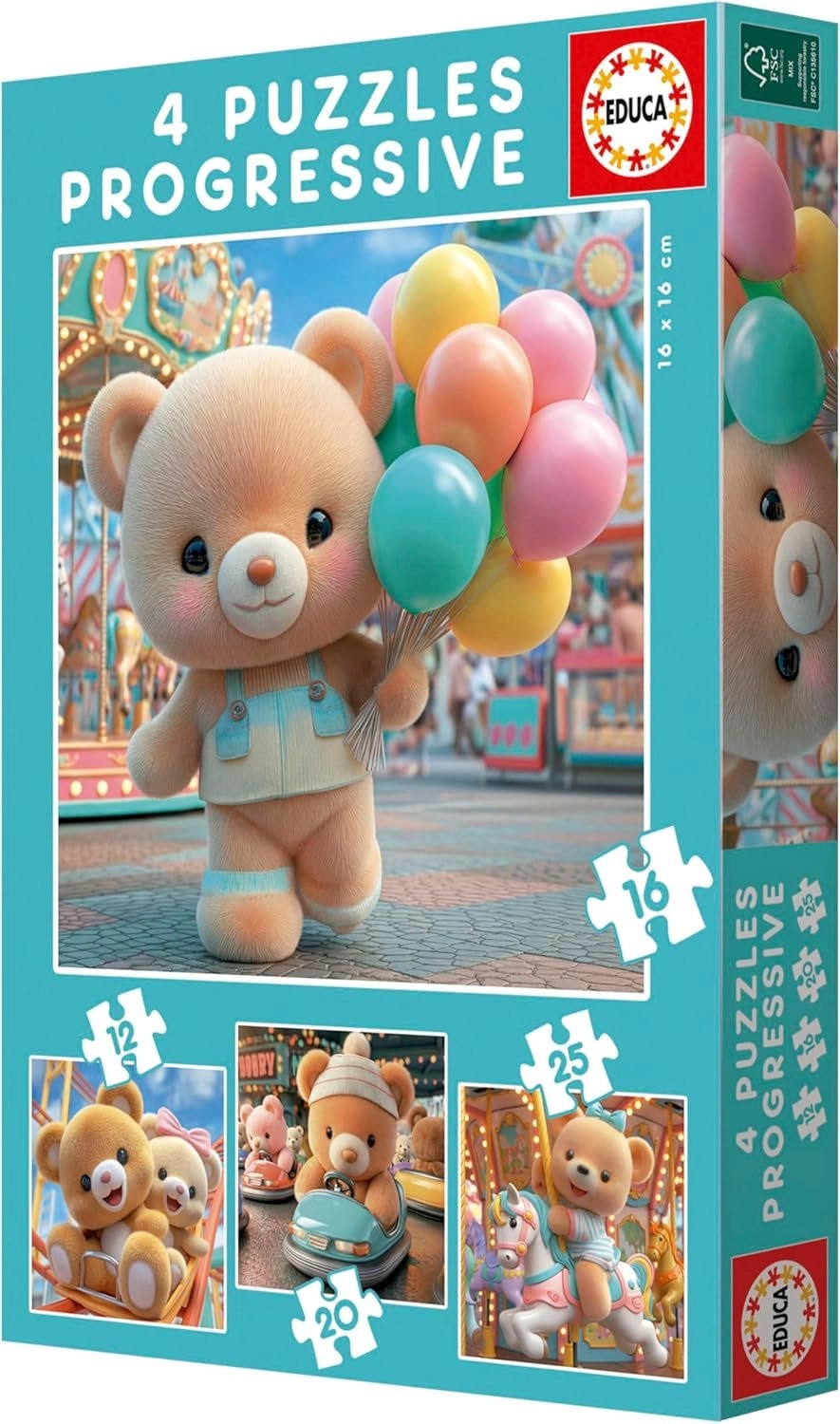 Découvrez le set ludique de puzzles progressifs EDUCA 4-en-1 avec un adorable motif d’ourson. Chaque puzzle comporte un nombre différent de pièces (12, 16, 20 et 25), permettant aux enfants d’entraîner progressivement leur motricité fine, leur pensée logique et leur patience. Idéal pour les premières tentatives grâce à des pièces solides et faciles à saisir et à un format compact d’environ 16 × 16 cm une fois assemblé.