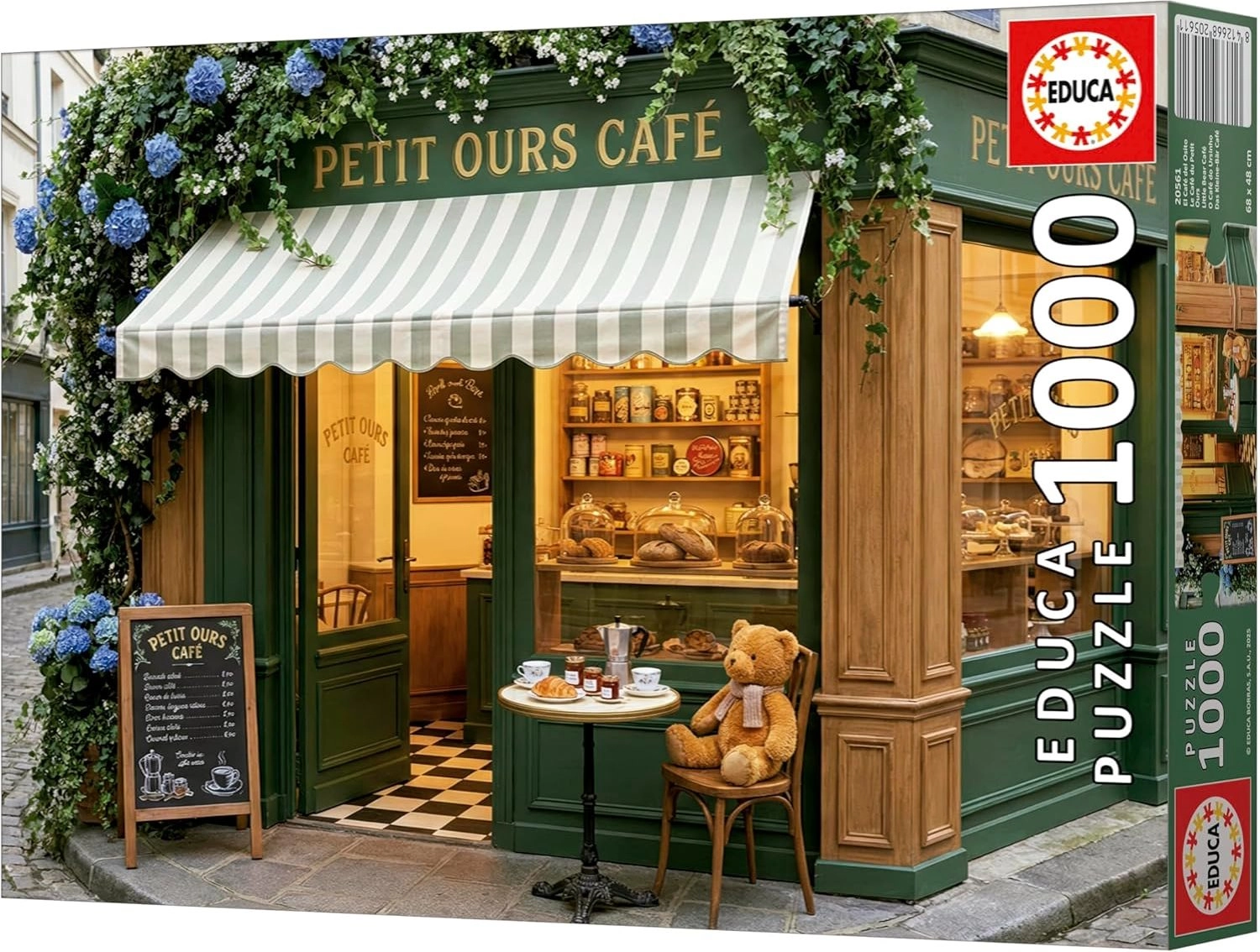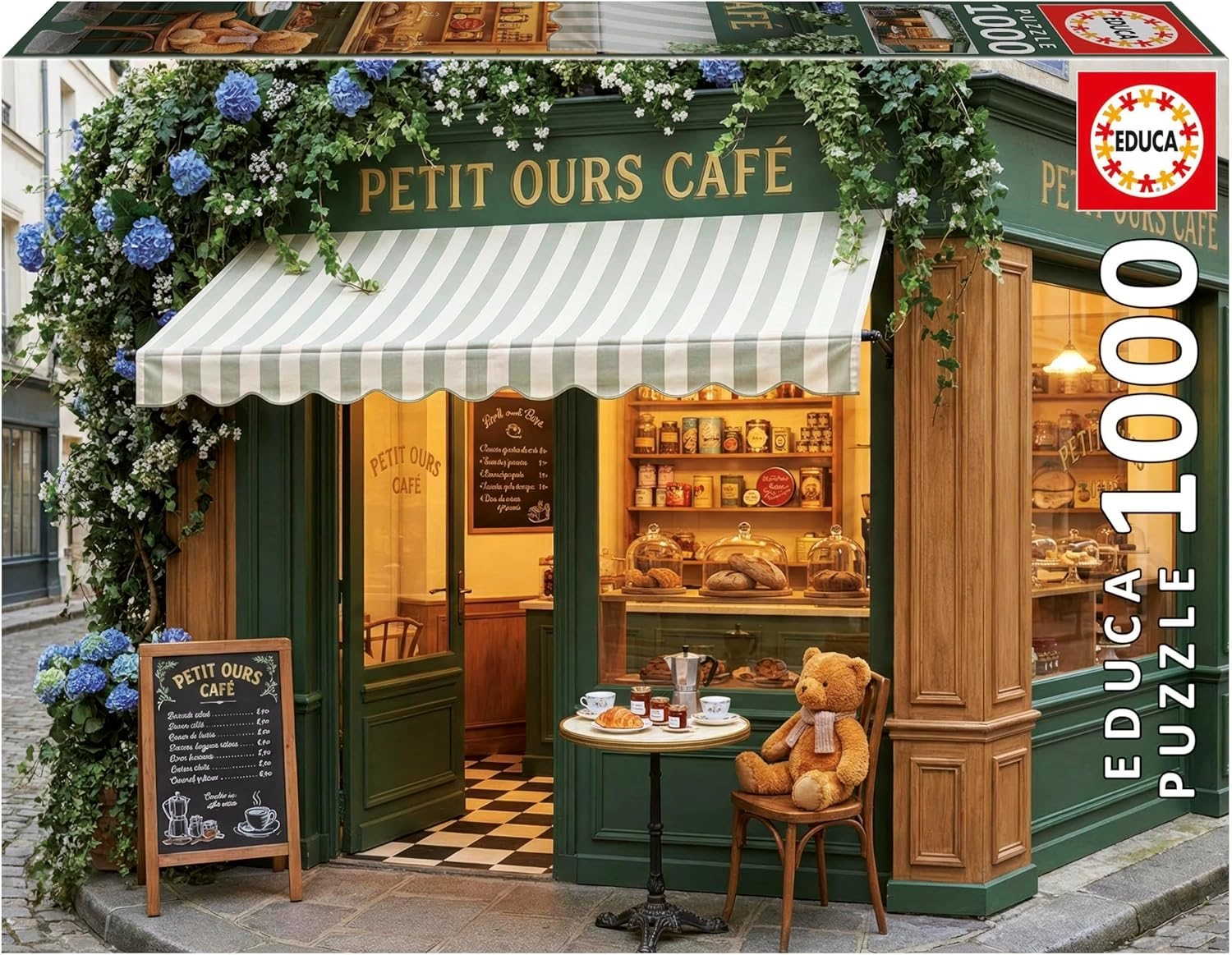Profitez d’un moment de détente avec le puzzle de qualité EDUCA, illustrant un adorable café rempli d’oursons. La boîte contient 1000 pièces et une colle OFFERTE pratique pour fixer facilement l’image terminée. Une fois assemblé, le puzzle forme une image décorative d’environ 68 × 48 cm.