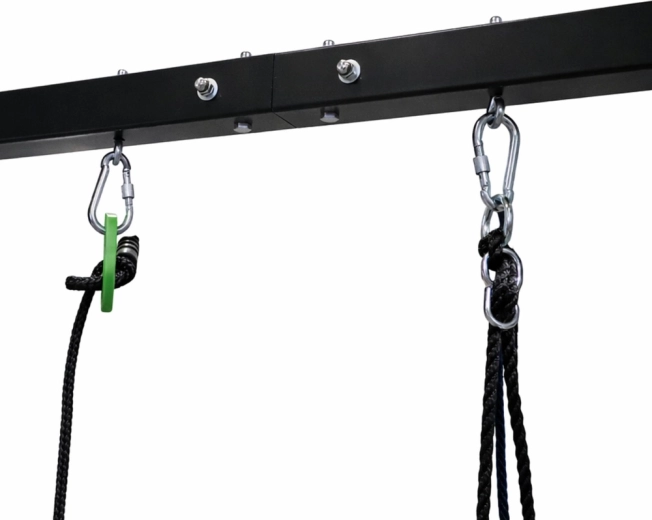 Des cordes résistantes avec mousquetons permettent une fixation rapide et un réglage de la hauteur des sièges selon l’âge et les besoins des enfants.