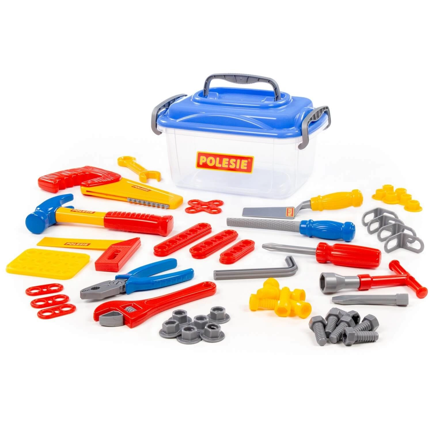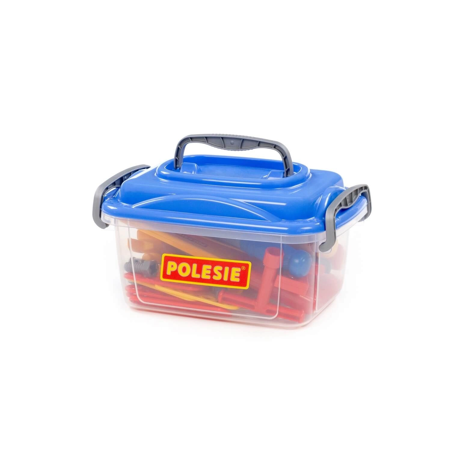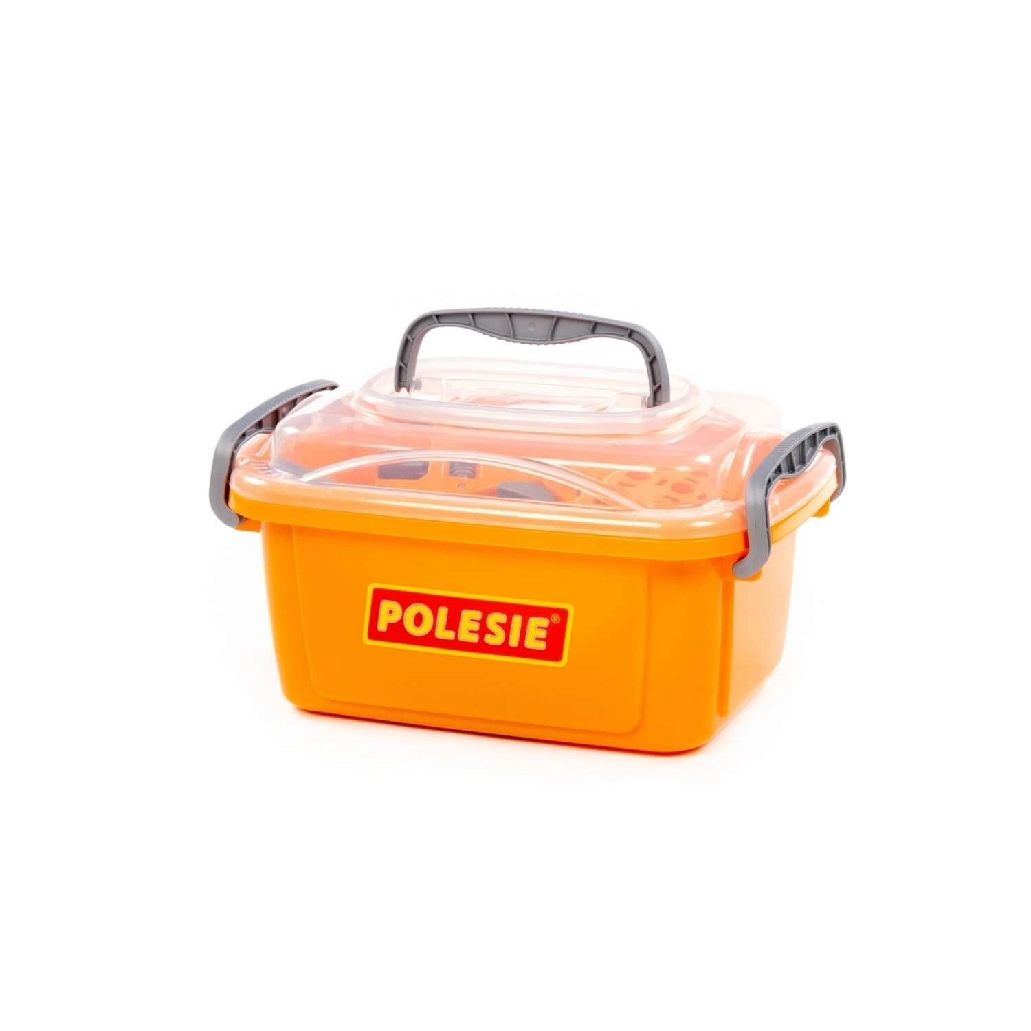 Des outils en plastique de qualité résistent aux jeux intensifs, et grâce au couvercle transparent, vous vérifiez rapidement si tout est à sa place.