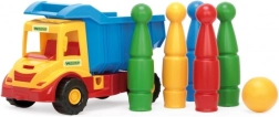 Camion benne Multi Truck avec une benne mobile offre du divertissement pour nos petits enfants. Inclus est un ensemble de quilles avec 5 quilles colorées et une boule.
