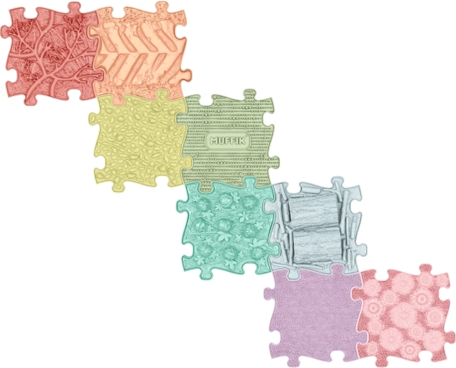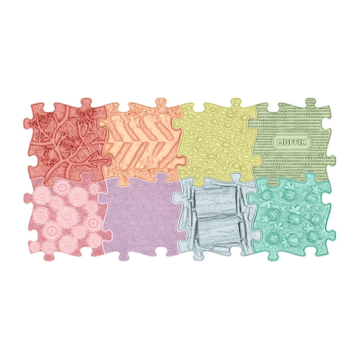 Ensemble de 8 tapis sensoriels modulaires MUFFIK aux douces couleurs pastel pour enfants dès 12 mois. Des surfaces variées – 4 souples et 4 dures – offrent une stimulation de la voûte plantaire, favorisent l’équilibre, la coordination et la perception sensorielle. Matériau sûr en PVC sans phtalates ni BPA, conforme aux normes EN-71 et CE.