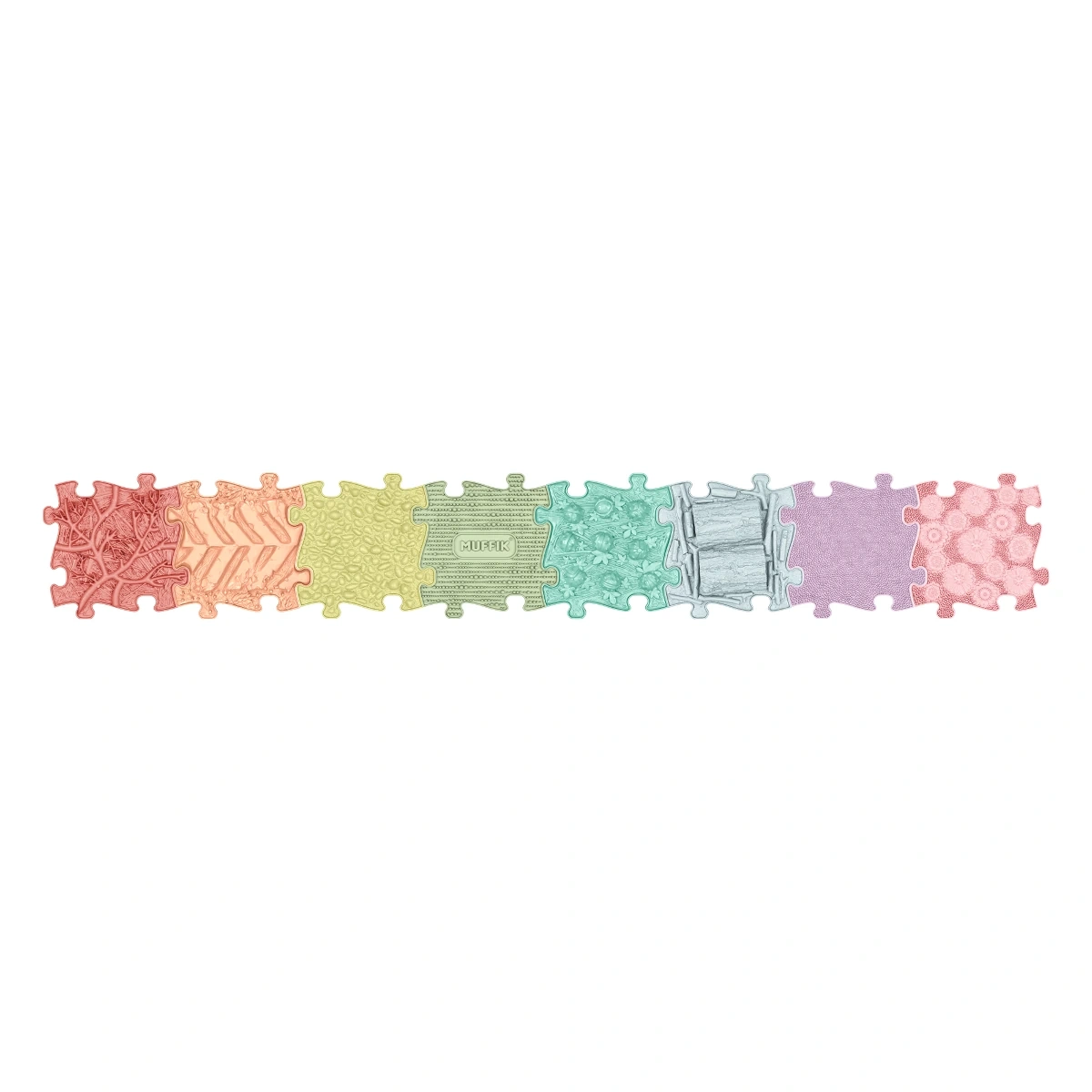 Huit pièces dans des tons pastel à assembler en itinéraires au choix. L’enfant conçoit son propre chemin et découvre de nouvelles sensations tactiles pas à pas.