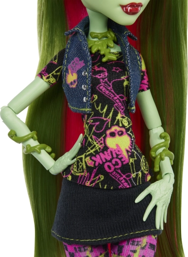 Venus McFlytrap séduit par ses motifs botaniques marqués, sa chevelure rose et verte et des bijoux détaillés. Sa structure souple avec 11 points d’articulation permet des poses réalistes et des histoires créatives dans l’univers MONSTER HIGH. L’ensemble inclut aussi son fidèle animal de compagnie Chewlian, ajoutant une valeur de collection.