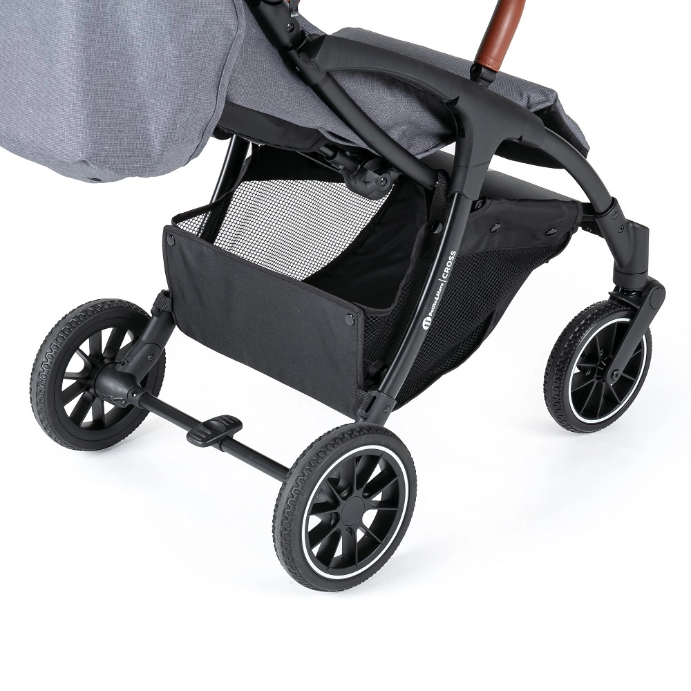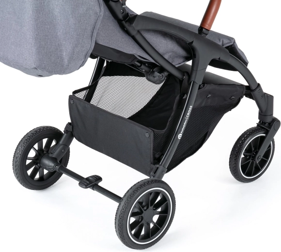 La poussette se conduit d’une seule main, dispose de roues avant entièrement pivotantes et d’un frein de stationnement centralisé pour un arrêt sécurisé. Les grandes roues avec suspension (20% caoutchouc, 80% EVA) lissent les aspérités et facilitent la conduite. Le panier inférieur pratique, d’une capacité de 3 kg et à accès aisé, accueille tout le nécessaire pour vos sorties.
