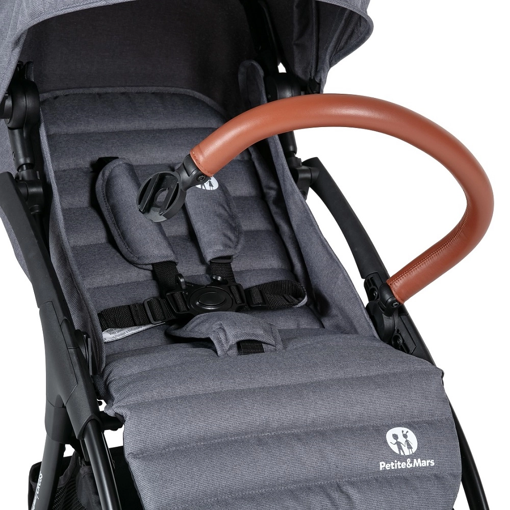 - Confort pour les parents – guidon et arceau en cuir écologique, arceau amovible pour installer facilement l’enfant, frein central.