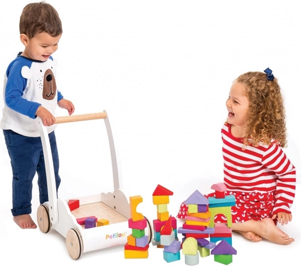 Le chariot avec blocs arc-en-ciel Petilou est conçu pour apporter confiance et stabilité aux enfants lors de leurs premiers pas. Il est équipé de 45 blocs dans diverses teintes de l’arc‑en‑ciel, favorisant le développement de la perception spatiale, de l’habileté et de la motricité.