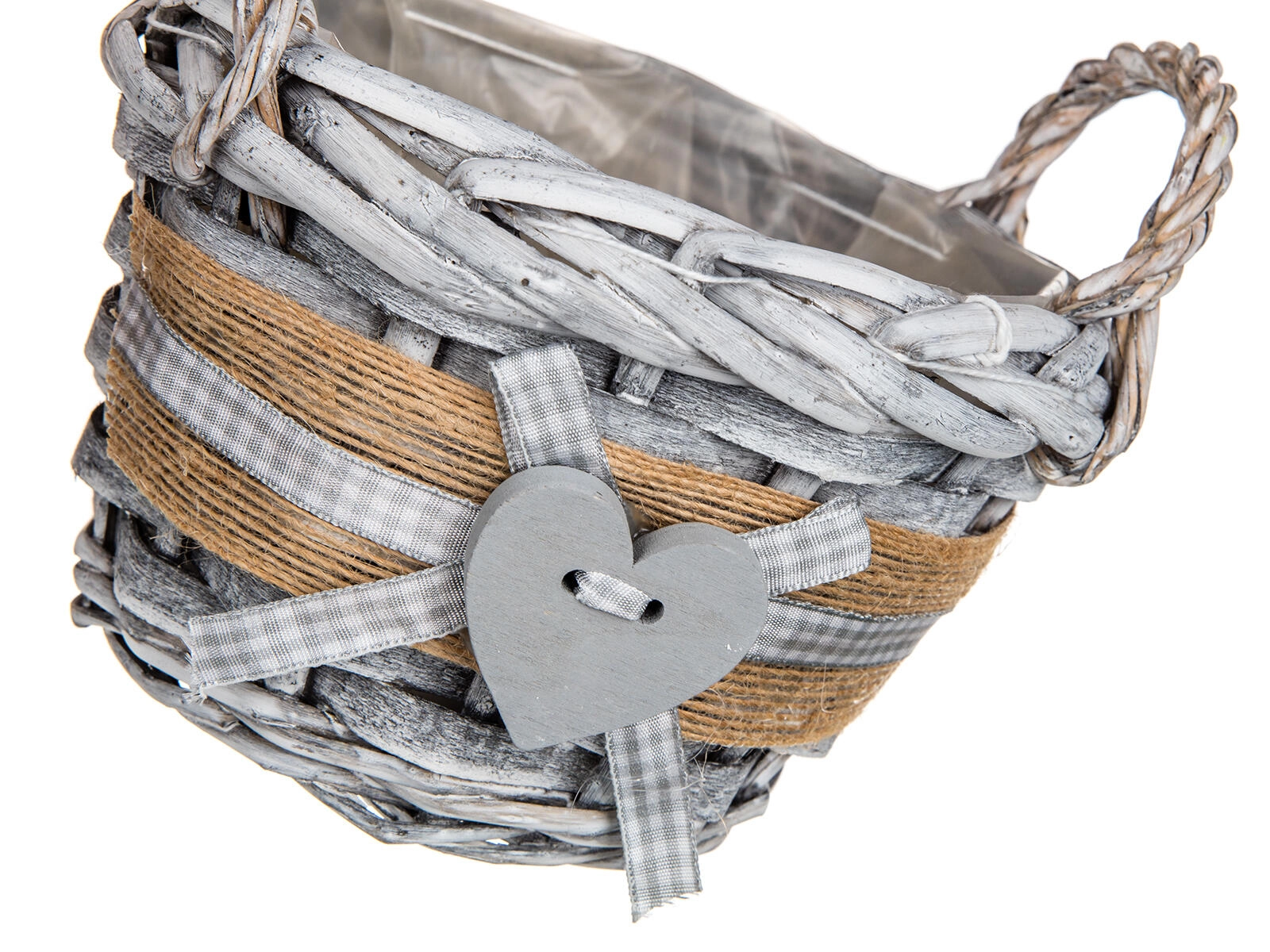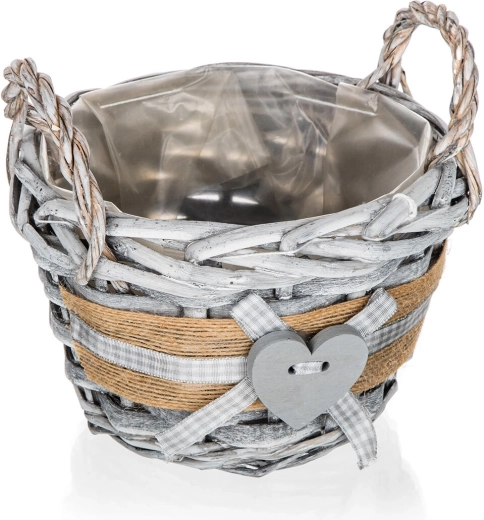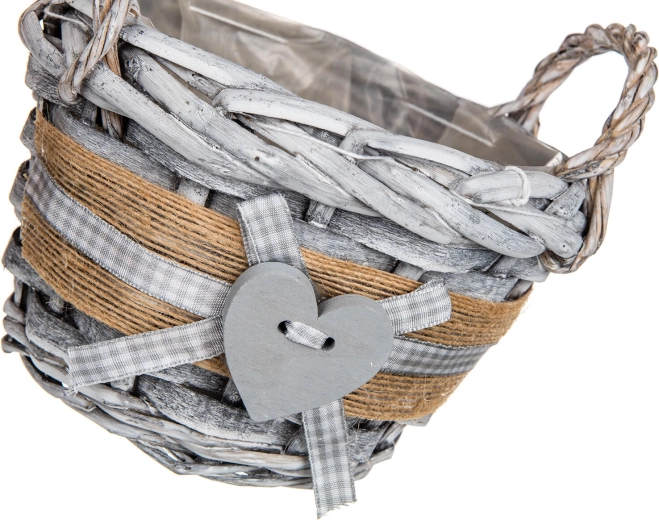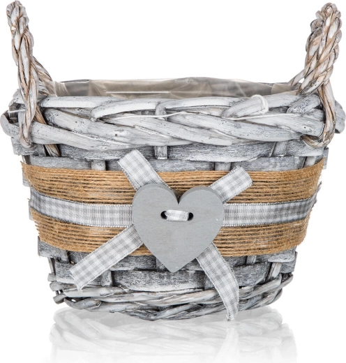 Élégant panier en osier GRIS de couleur grise, dimensions 14 × 10 cm, idéal pour les compositions décoratives, petits accessoires et décorations saisonnières. Il possède des poignées latérales pratiques, une doublure plastique de protection à l’intérieur et séduit par son design rustique avec cœur et ornementation en jute.